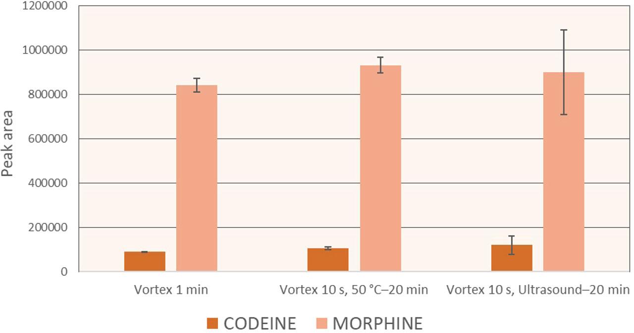 ![Effect of different extraction conditions on the peak area. Citrate buffer (0.1 mol/L, pH=4, V=10 mL) was used for extraction. Samples [dehydrated lucerne (sample 1) with a mass fraction of 327 ng/g codeine and 1510 ng/g morphine] were prepared in triplicate. Results were expressed as mean ± standard deviation](https://sciendo-parsed.s3.eu-central-1.amazonaws.com/67fc33abdf7b4851cb85b2ba/j_aiht-2025-76-3888_fig_001.jpg?X-Amz-Algorithm=AWS4-HMAC-SHA256&X-Amz-Content-Sha256=UNSIGNED-PAYLOAD&X-Amz-Credential=ASIA6AP2G7AKL2Y7WIZC%2F20260306%2Feu-central-1%2Fs3%2Faws4_request&X-Amz-Date=20260306T032532Z&X-Amz-Expires=3600&X-Amz-Security-Token=IQoJb3JpZ2luX2VjEA4aDGV1LWNlbnRyYWwtMSJIMEYCIQCvkutjJqAI%2BOtw%2FVa7CPrK2sgqSovc7QTqwFBXJ5VjlwIhAJcpa0Gf%2B9CJ7fm1UmJI%2FR7PIp1pjxGx4E7NuGCLwUO5KsYFCNf%2F%2F%2F%2F%2F%2F%2F%2F%2F%2FwEQAhoMOTYzMTM0Mjg5OTQwIgyy3tRNoypwe8WkTQoqmgV1yJ8eHHP4VzrhebJ9hYS2Eid%2BY0TfKLydMNNFx4eM2k9ABC7YfxGDjDY3aPYLflIGrci6Ltu24CNc1CjDn99c2Mpx5QpFUoUbZ2eiq1TaihBPTjY0K%2FP04XI9XR8AYZFXkXfb%2BQI3Q%2BFmHyAsoEjxk2OmA0IvrkQDYxXleGrecM4t2GgjPQyu7AlffpLAOhMdiWJa59nZT7rLDYDbedvSFDNQsXAm9UIyn%2ByAwVwupg2vGo0D6tETkE8sCYmbn5sAKg5MJUnVD59%2FmgGrcbwDQk4xBvwGeU94ssoMZHMMBwYzre7lCDS65GrTXdJKMev6j1OeA5u4SVSKKzfIwVnISCxnqLHiq211H3Oe4jE%2FbO615VWuSVcHLMCckjS8qIviJ2e966IJ%2BaGGp8%2BVVDIXGNkcWDu6jmO3yxtBvCv0G5vTXNE%2BOcjYPnXXluCTCylmk5sChNJ43k%2BSwZjGRa2y%2BFGBy2VjSqWwuGCCdrnJ7dv%2FyEuR0iU5Hkp7cZqur1o9xJ2Dk5RPP9mOaF0v4vByuP8eNUGsg%2F%2BKCQuZsi145n8D2srQo0j%2BGQ6VCLKV35r3sjvCuqLYowJ4he9fisObDFCKLYuAqc%2FKK5Gye6DywQAbHq6QAtEk%2BaTnkemGBKfXA%2BizLqdpW9DeVYYosVdqwDY0J0Gru97MT3iWIf7PeEXE1pVBYuSb9qh8LK35iOUM84DYhGfYDNufvNo6lc4jjrivd6TSv24hdrjzUp%2FZH4pGBt%2Bd4dCI6Fe3UyT1EtBtd0%2BRz4dE7uwPH%2Fzt3Cihg%2FxjIA9BdLVMVgziH4yB4XsvQUyIyOI%2B122NyLVul8lsNHvylytrlrnkWY%2FplwlDZ26S2nrc20OxX3G4m02GjMPY7kdjAnxp5w0w1fWnzQY6sAFnVzZpAPfXiLGX2nc%2FW17F800C2zoPEAmUhnZsVZ%2BMiFokhis75RPmIoScfPjHfas9YCqKZ0vW6SXatMdvWNbCX6w9x36rsq86tmOUSZMwDP3s%2B1NW9wvht95zVk3fQ%2FPtK%2F8QnIL2jW1dW79W2EfGnn6Idiw%2B%2FqKEpcPFlD2Ytmd3bDFbln1UcNodNNjSiLOQfKPoIELVteGNz7VeKquRJds05MHc3GhcnvGyxrjn1Q%3D%3D&X-Amz-Signature=f4259ff34c9a126c74225792006df8e65748cbd8b2fa4436e7ba879bf754406e&X-Amz-SignedHeaders=host&x-amz-checksum-mode=ENABLED&x-id=GetObject)