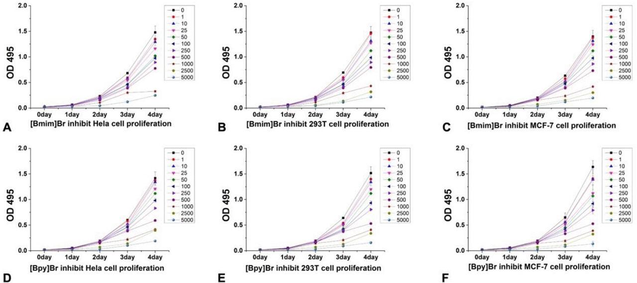 ![Proliferation curves for [Bmim]Br in A) MCF-7; B) HeLa; and C) HEK293T cells and for [Bpy]Br in D) HeLa; E) HEK293T; and F) MCF-7 cells](https://sciendo-parsed.s3.eu-central-1.amazonaws.com/68d132fb81e1b9341968ba60/j_aiht-2025-76-3966_fig_001.jpg?X-Amz-Algorithm=AWS4-HMAC-SHA256&X-Amz-Content-Sha256=UNSIGNED-PAYLOAD&X-Amz-Credential=ASIA6AP2G7AKL2Y7WIZC%2F20260306%2Feu-central-1%2Fs3%2Faws4_request&X-Amz-Date=20260306T032532Z&X-Amz-Expires=3600&X-Amz-Security-Token=IQoJb3JpZ2luX2VjEA4aDGV1LWNlbnRyYWwtMSJIMEYCIQCvkutjJqAI%2BOtw%2FVa7CPrK2sgqSovc7QTqwFBXJ5VjlwIhAJcpa0Gf%2B9CJ7fm1UmJI%2FR7PIp1pjxGx4E7NuGCLwUO5KsYFCNf%2F%2F%2F%2F%2F%2F%2F%2F%2F%2FwEQAhoMOTYzMTM0Mjg5OTQwIgyy3tRNoypwe8WkTQoqmgV1yJ8eHHP4VzrhebJ9hYS2Eid%2BY0TfKLydMNNFx4eM2k9ABC7YfxGDjDY3aPYLflIGrci6Ltu24CNc1CjDn99c2Mpx5QpFUoUbZ2eiq1TaihBPTjY0K%2FP04XI9XR8AYZFXkXfb%2BQI3Q%2BFmHyAsoEjxk2OmA0IvrkQDYxXleGrecM4t2GgjPQyu7AlffpLAOhMdiWJa59nZT7rLDYDbedvSFDNQsXAm9UIyn%2ByAwVwupg2vGo0D6tETkE8sCYmbn5sAKg5MJUnVD59%2FmgGrcbwDQk4xBvwGeU94ssoMZHMMBwYzre7lCDS65GrTXdJKMev6j1OeA5u4SVSKKzfIwVnISCxnqLHiq211H3Oe4jE%2FbO615VWuSVcHLMCckjS8qIviJ2e966IJ%2BaGGp8%2BVVDIXGNkcWDu6jmO3yxtBvCv0G5vTXNE%2BOcjYPnXXluCTCylmk5sChNJ43k%2BSwZjGRa2y%2BFGBy2VjSqWwuGCCdrnJ7dv%2FyEuR0iU5Hkp7cZqur1o9xJ2Dk5RPP9mOaF0v4vByuP8eNUGsg%2F%2BKCQuZsi145n8D2srQo0j%2BGQ6VCLKV35r3sjvCuqLYowJ4he9fisObDFCKLYuAqc%2FKK5Gye6DywQAbHq6QAtEk%2BaTnkemGBKfXA%2BizLqdpW9DeVYYosVdqwDY0J0Gru97MT3iWIf7PeEXE1pVBYuSb9qh8LK35iOUM84DYhGfYDNufvNo6lc4jjrivd6TSv24hdrjzUp%2FZH4pGBt%2Bd4dCI6Fe3UyT1EtBtd0%2BRz4dE7uwPH%2Fzt3Cihg%2FxjIA9BdLVMVgziH4yB4XsvQUyIyOI%2B122NyLVul8lsNHvylytrlrnkWY%2FplwlDZ26S2nrc20OxX3G4m02GjMPY7kdjAnxp5w0w1fWnzQY6sAFnVzZpAPfXiLGX2nc%2FW17F800C2zoPEAmUhnZsVZ%2BMiFokhis75RPmIoScfPjHfas9YCqKZ0vW6SXatMdvWNbCX6w9x36rsq86tmOUSZMwDP3s%2B1NW9wvht95zVk3fQ%2FPtK%2F8QnIL2jW1dW79W2EfGnn6Idiw%2B%2FqKEpcPFlD2Ytmd3bDFbln1UcNodNNjSiLOQfKPoIELVteGNz7VeKquRJds05MHc3GhcnvGyxrjn1Q%3D%3D&X-Amz-Signature=30bb3fc10ec56fc5c163f5730f42a0b3ad4caf494c06eb2674e9dc99a85a464f&X-Amz-SignedHeaders=host&x-amz-checksum-mode=ENABLED&x-id=GetObject)