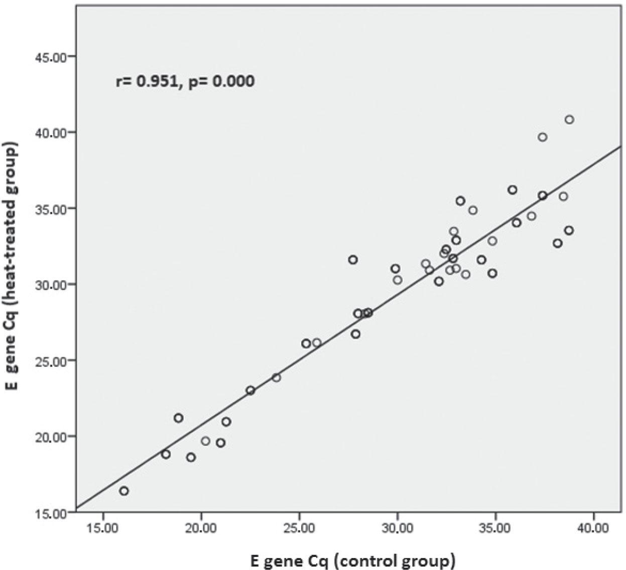 Paired comparison of mean Cq values between the control and heat-treated SARS-CoV-2-positive samples