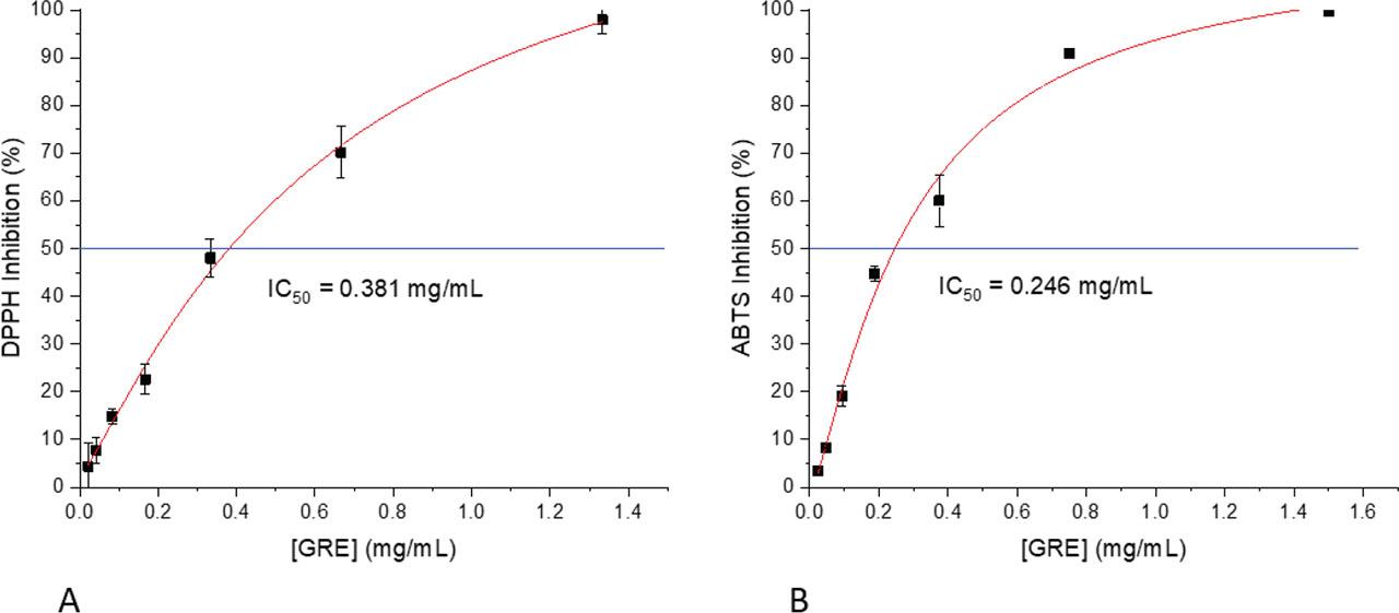 Figure 1 shows the radical-scavenging capacity of GRE, which increased with concentrations. The calculated for DPPH• IC50 was 0.371±0.031 mg/mL, while the maximum inhibition of 97.9 % was achieved with 1.33 mg/mL. The ABTS• IC50 was 0.246±0.018 mg/mL, and the maximum inhibition of 99.6 % was achieved with 1.5 mg/mL.