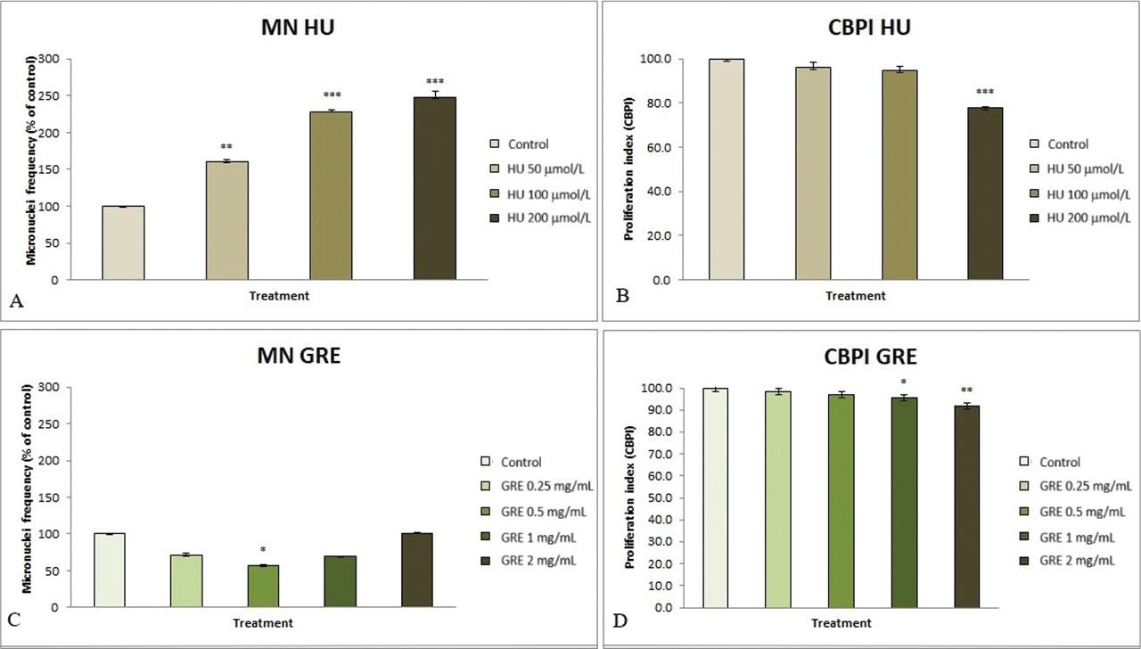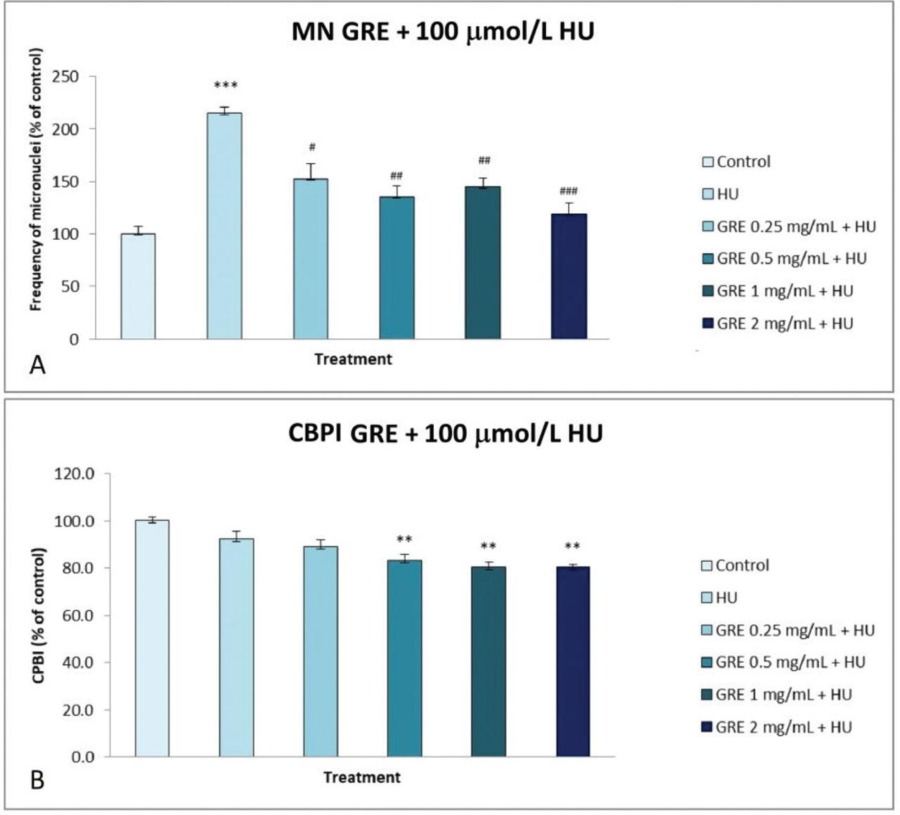 The genoprotective effect of GRE against HU was evaluated with the CBMN assay and by monitoring micronucleus frequency and proliferation indices.