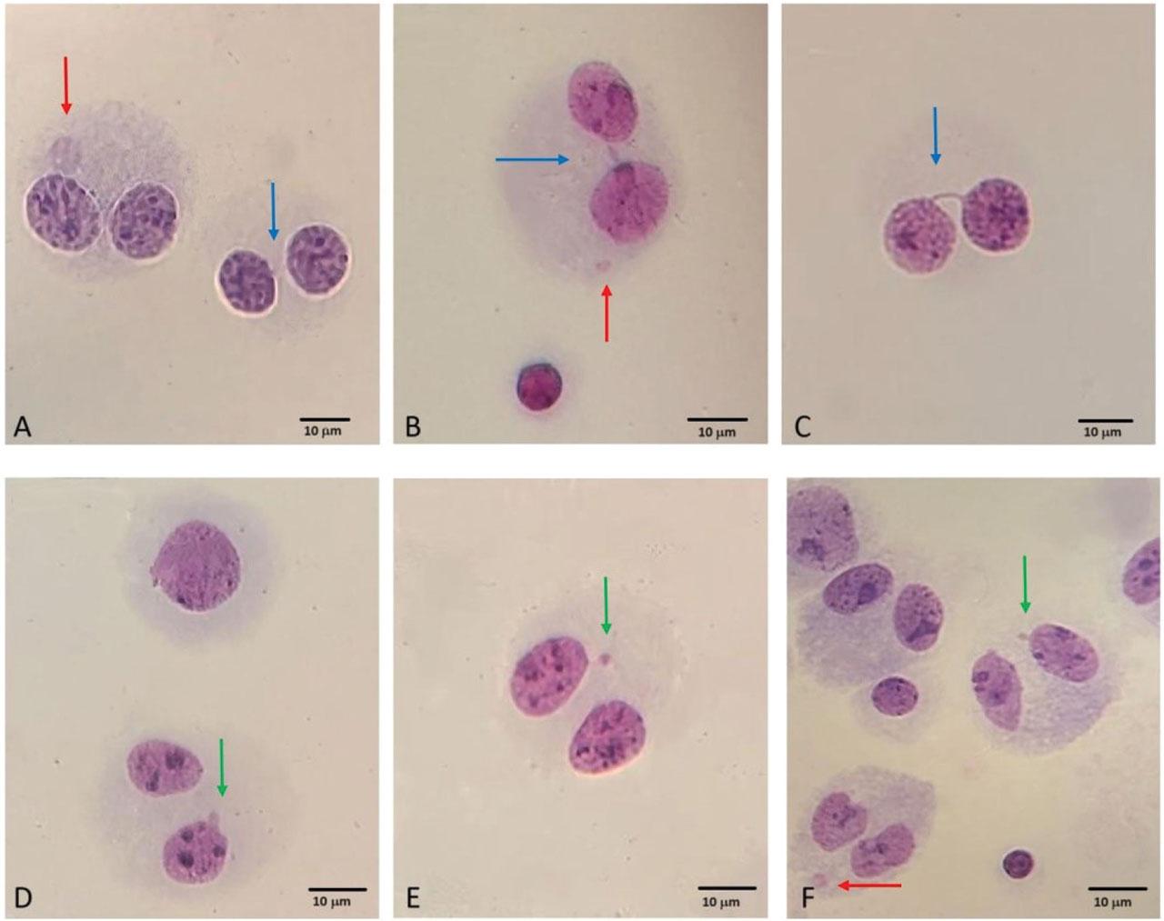 Representative photomicrographs of binuclear cells (CBMN assay): HU treatment (A, B, C), micronuclei (red arrows) and nucleoplasmic bridges (blue arrows); GRE pre-treatment and HU treatment (D, E, F), micronuclei (red arrows) and nuclear buds (green arrows) (scale bar=10 µm). CBMN – cytokinesis-block micronucleus; GRE – yellow gentian (Gentiana lutea L.) root extract; HU – hydroxyurea