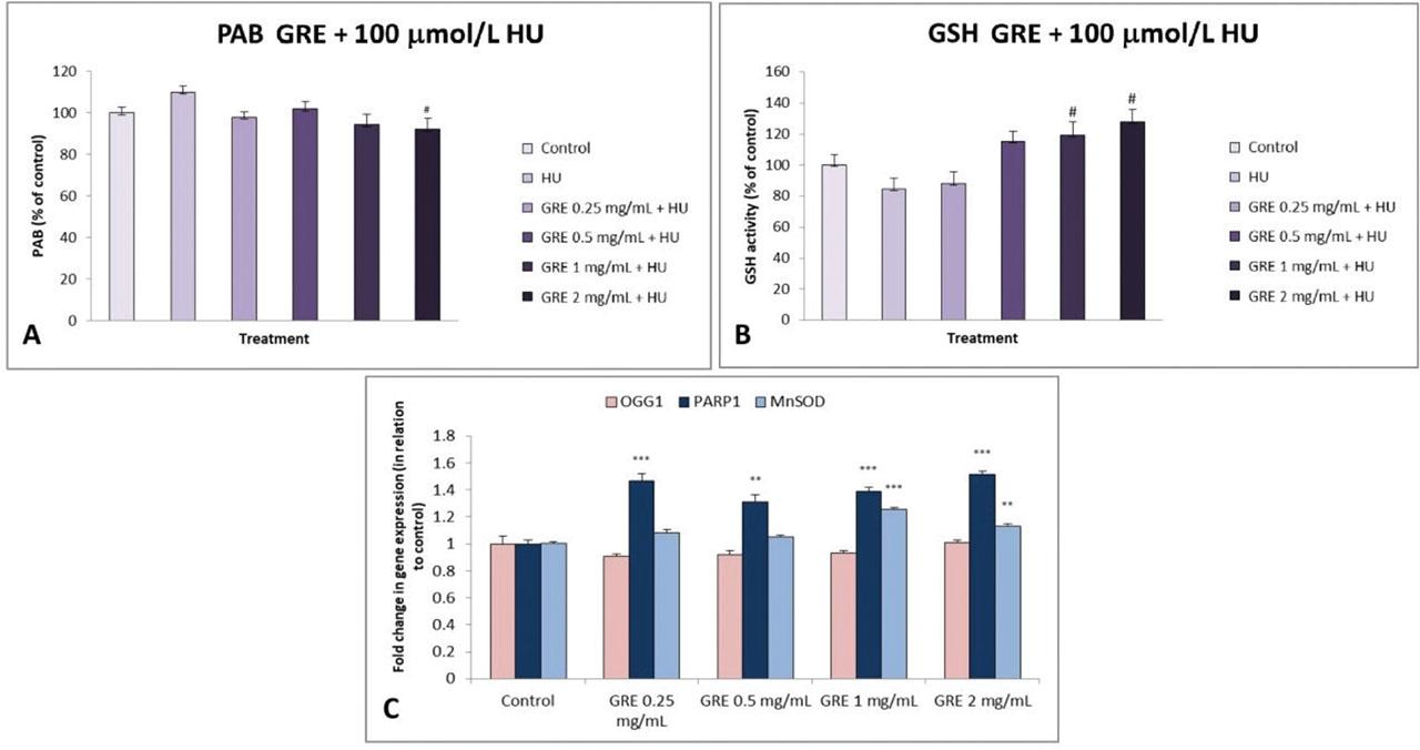 We also determined the pro-oxidant/anti-oxidant balance (PAB), GSH levels, and the expression of genes involved in DNA damage repair (OGG1 and PARP1) and antioxidant repair (MnSOD) to identify mechanisms by which GRE accomplishes genoprotective effect. Untreated cell cultures served as negative, and HU-alone-treated cultures as positive control.