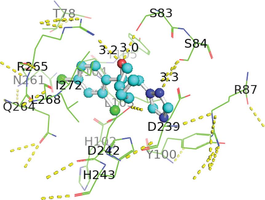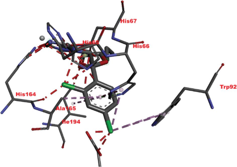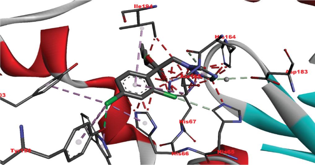 | 1-[[(2S,4S)-2-(2,4-dichlorophenyl)-4-propyl-1,3-dioxolan-2-yl] methyl]-1,2,4-triazole | −7.1 | HIS67, HIS66, TRP92, ILE192, ALA165, HIS164, HIS65 | 3.94, 4.85, 4.71, 4.31, 4.57, 3.68 | Pi-lone pair, Pi-alkyl, Pi-Pi T-shaped, Van der Waals forces |