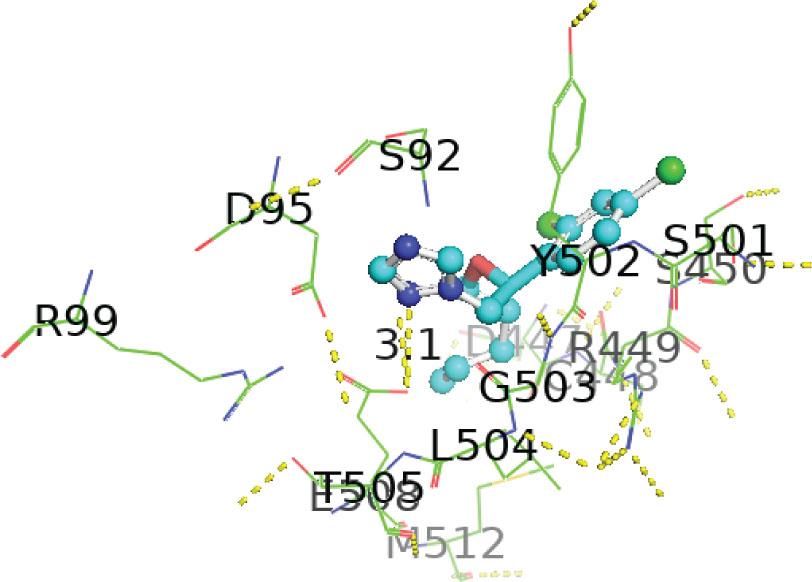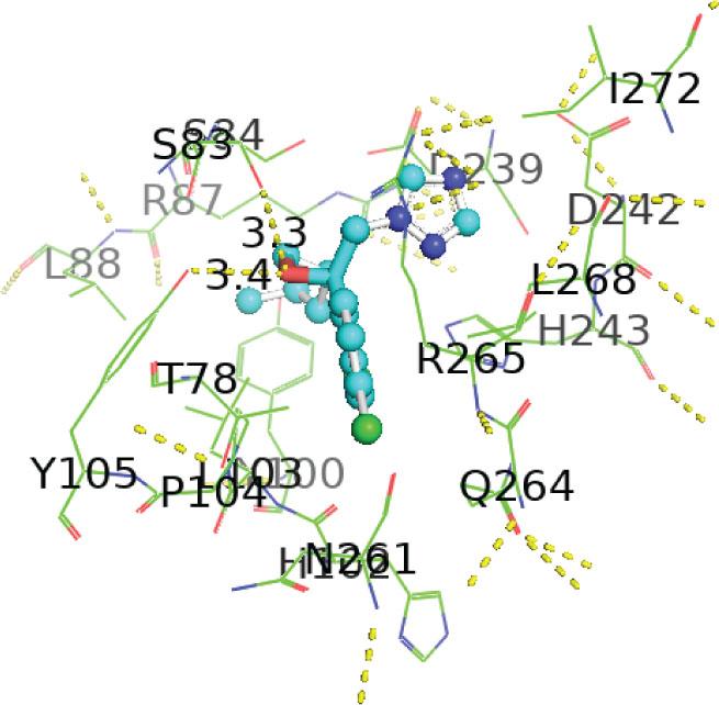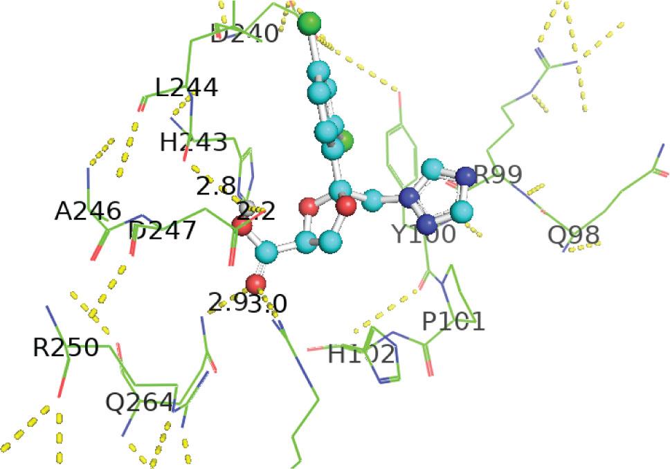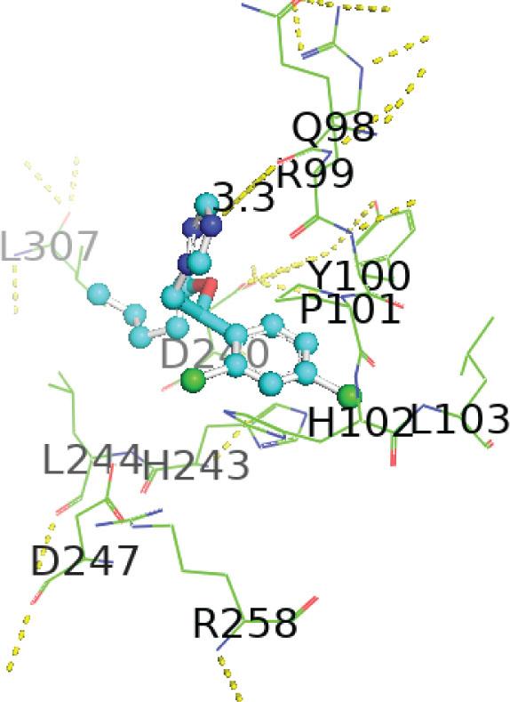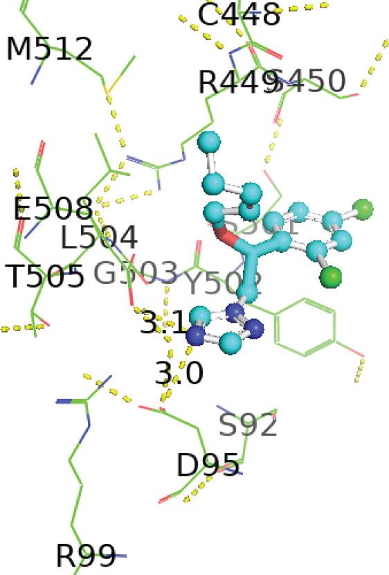 | 1-[[2-(2,4-Dichlorophenyl)-4-(2,2,3,3,3-pentadeuteriopropyl)-1,3-dioxolan-2-yl]methyl]-1,2,4-triazole | −7.1 | ILE194, HIS164, ASP183, ALA165, TYR139 HIS67, HIS66, HIS65, | 4.42, 2.95, 2.75, 4.44, 5.50, 5.41, 3.76, 4.82, 2.70, 3.61, 2.08 | Alkyl, pi-alkyl, conventional, Pi-Pi T-shaped, carbon, Waals forces hydrogen bonds, Van der |