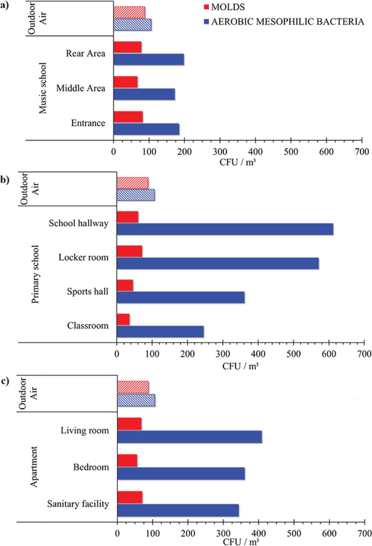Total fungal (red) and bacterial (blue) counts in different areas of the a) music school, b) primary school, and c) apartment, and the respective outdoor counts