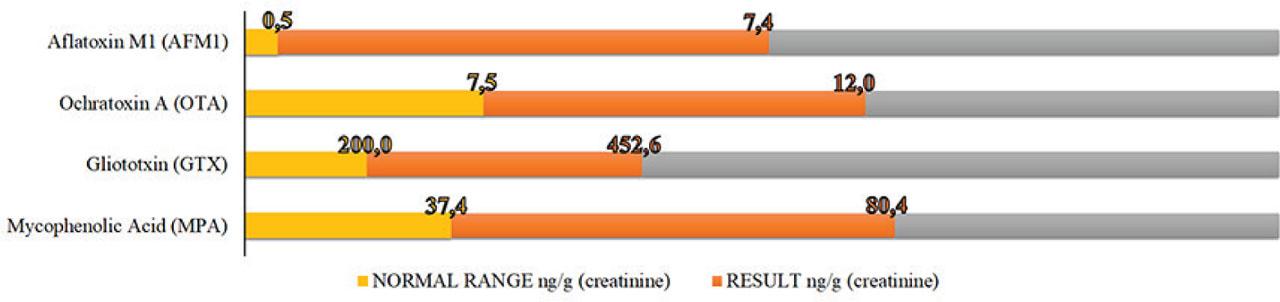 Mycotoxins were determined with the MycoTOX Profile (Mosaic Diagnostics), a modern test which utilises liquid chromatography to detect up to 11 free (unconjugated) mycotoxins even at low levels as described elsewhere (39).