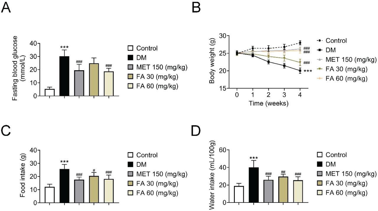 Effects of forsythoside A administration on: A) fasting blood glucose; B) body weight; C) food intake; and D) water intake in diabetic mice. *** p<0.001 vs control. # p<0.05; ## p<0.01; ### p<0.001 vs DM. DM – diabetic mice; FA – forsythoside A; MET – metformin