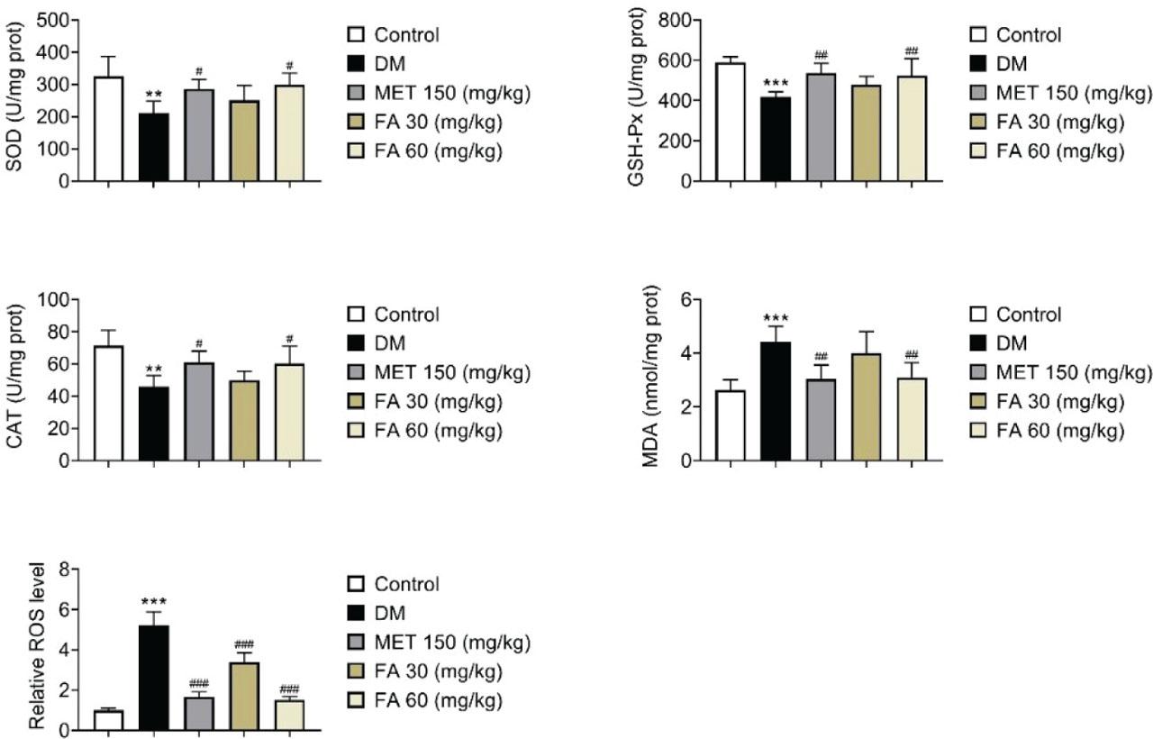 Effects of forsythoside A administration on oxidative stress parameters in diabetic mice. ** p<0.01; *** p<0.001 vs control. # p<0.05, ## p<0.01, ### p<0.001 vs DM. DM – diabetic mice; FA – forsythoside A; MET – metformin
