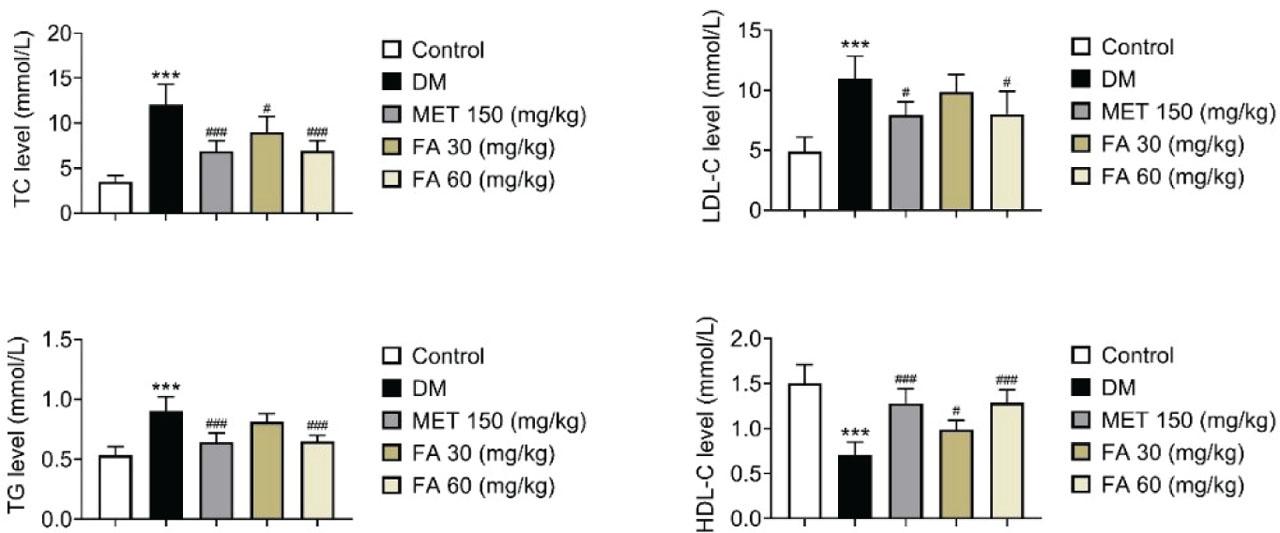Changes in lipid accumulation in diabetic mice treated with forsythoside A. *** p<0.001 vs control. # p<0.05; ### p<0.001 vs DM. DM – diabetic mice; FA – forsythoside A; HDL – high-density lipoprotein; LDL – low-density lipoprotein; MET – metformin; TC – total cholesterol; TG – triglycerides