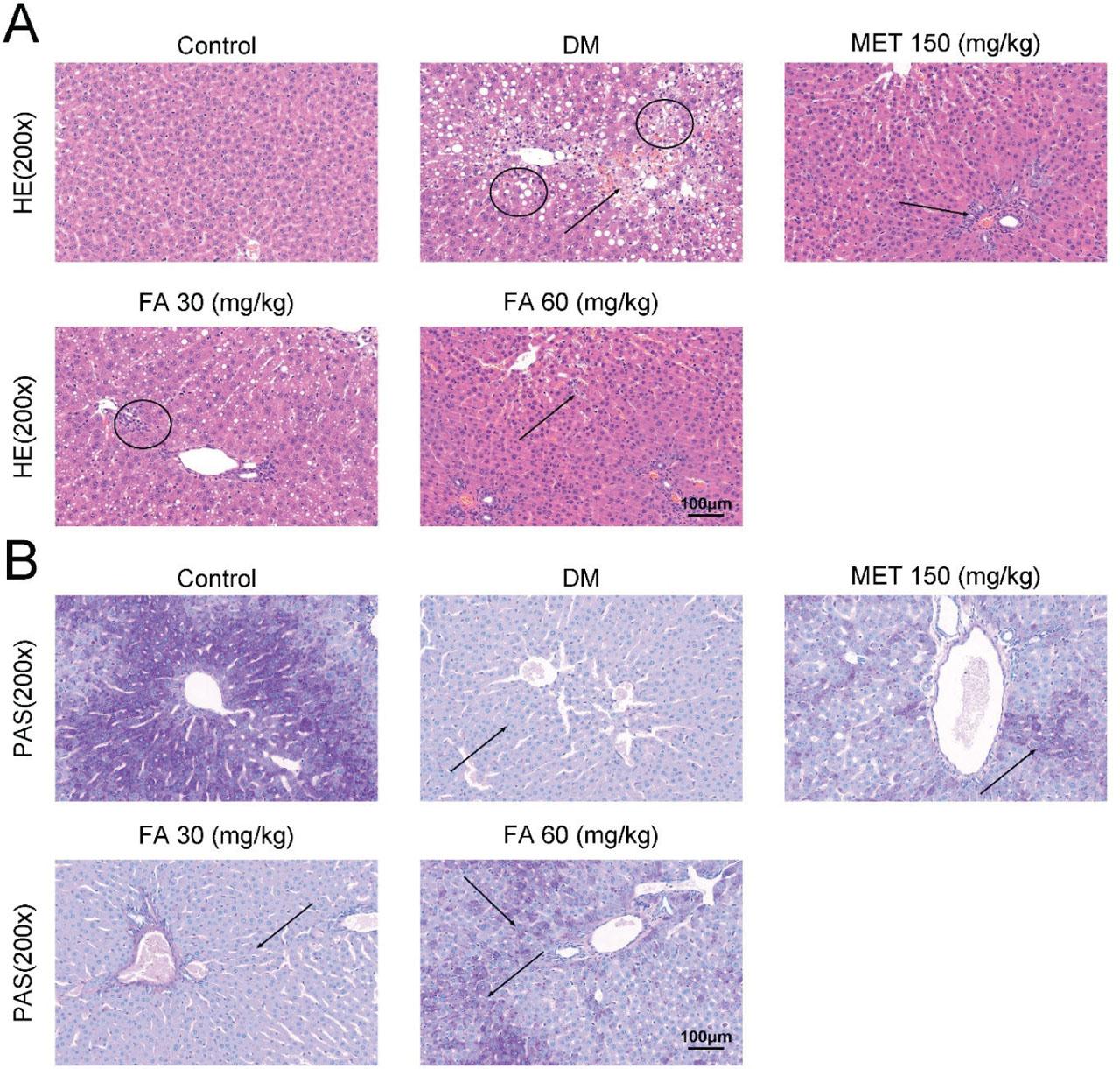 Histopathological changes in diabetic mice treated with forsythoside A vs control (200× magnification) visualised with A) HE staining showing focal necroses (circles) and mussy hepatic cords (arrows) and B) PAS staining showing hepatocyte glycogen accumulation (arrows). DM – diabetic mice; FA – forsythoside A; HE – haematoxylin and eosin; MET – metformin; PAS – periodic acid and Schiff