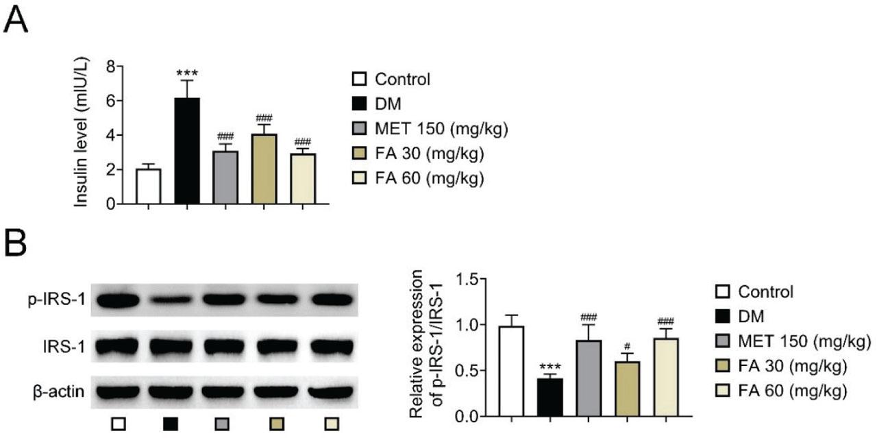 Forsythoside A-induced changes in A) serum insulin and B) p-IRS-1 expression in diabetic mice *** p<0.001 vs control. # p<0.05; ### p<0.001 vs DM. DM – diabetic mice; FA – forsythoside A; MET – metformin