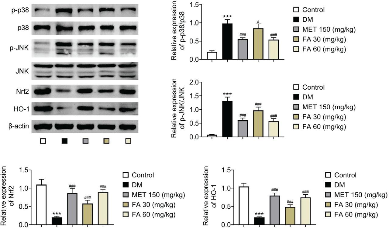 Forsythoside A-mediated changes in MAPK and Nrf2 pathways in diabetic mice. *** p<0.001 vs control. # p<0.05; ### p<0.001 vs DM. DM – diabetic mice; FA – forsythoside A; MET – metformin