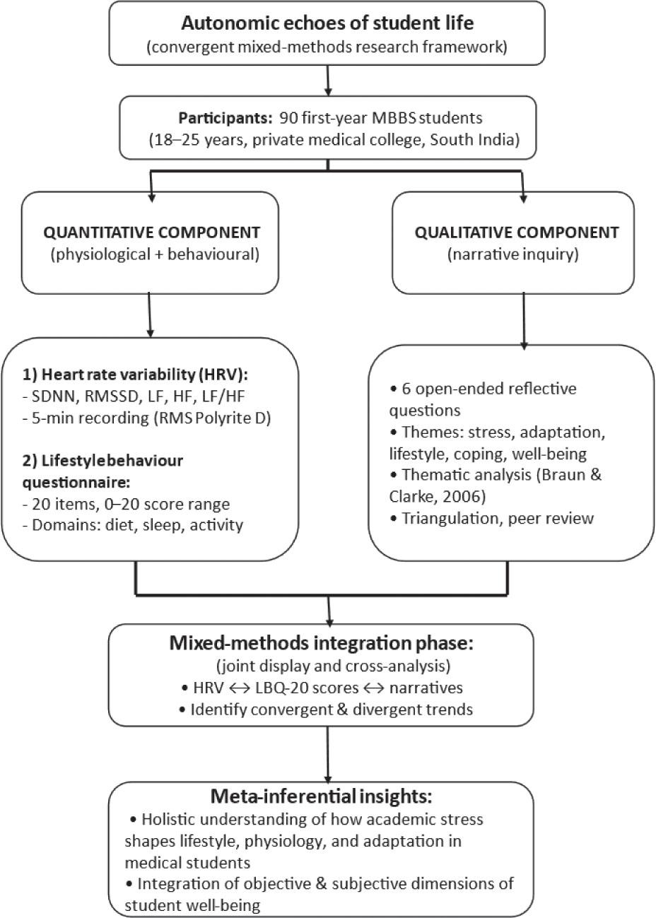 Joint display matrix integrating LBQ-20 scores, HRV variables, and qualitative theme analysis among first-year medical students in South India
