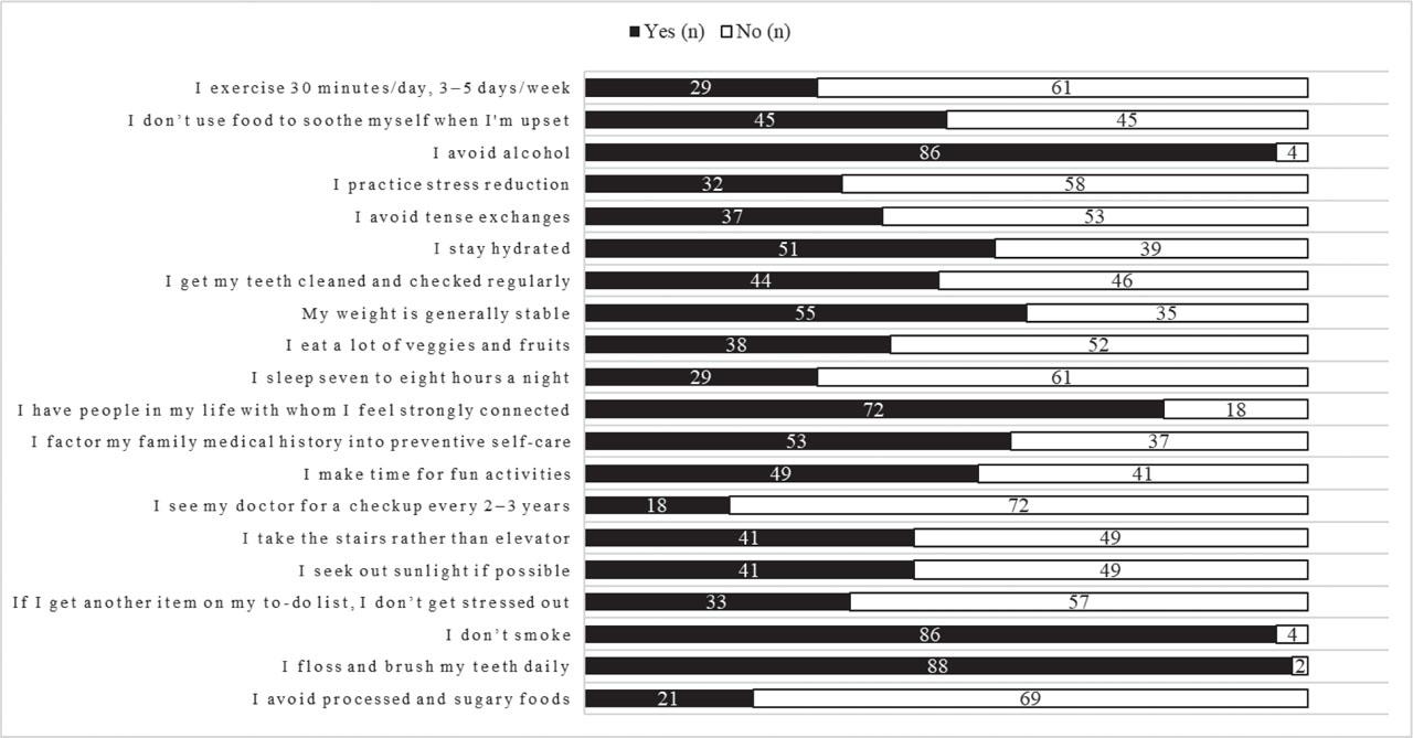 | LBQ-20 score | Mean=9.46 (SD=3.16): moderate overall adherence to healthy lifestyle practices | Lifestyle supports health | Students report moderate adherence to health behaviours: hygiene and avoidance of smoking & alcohol habits are the most adhered to practices. |