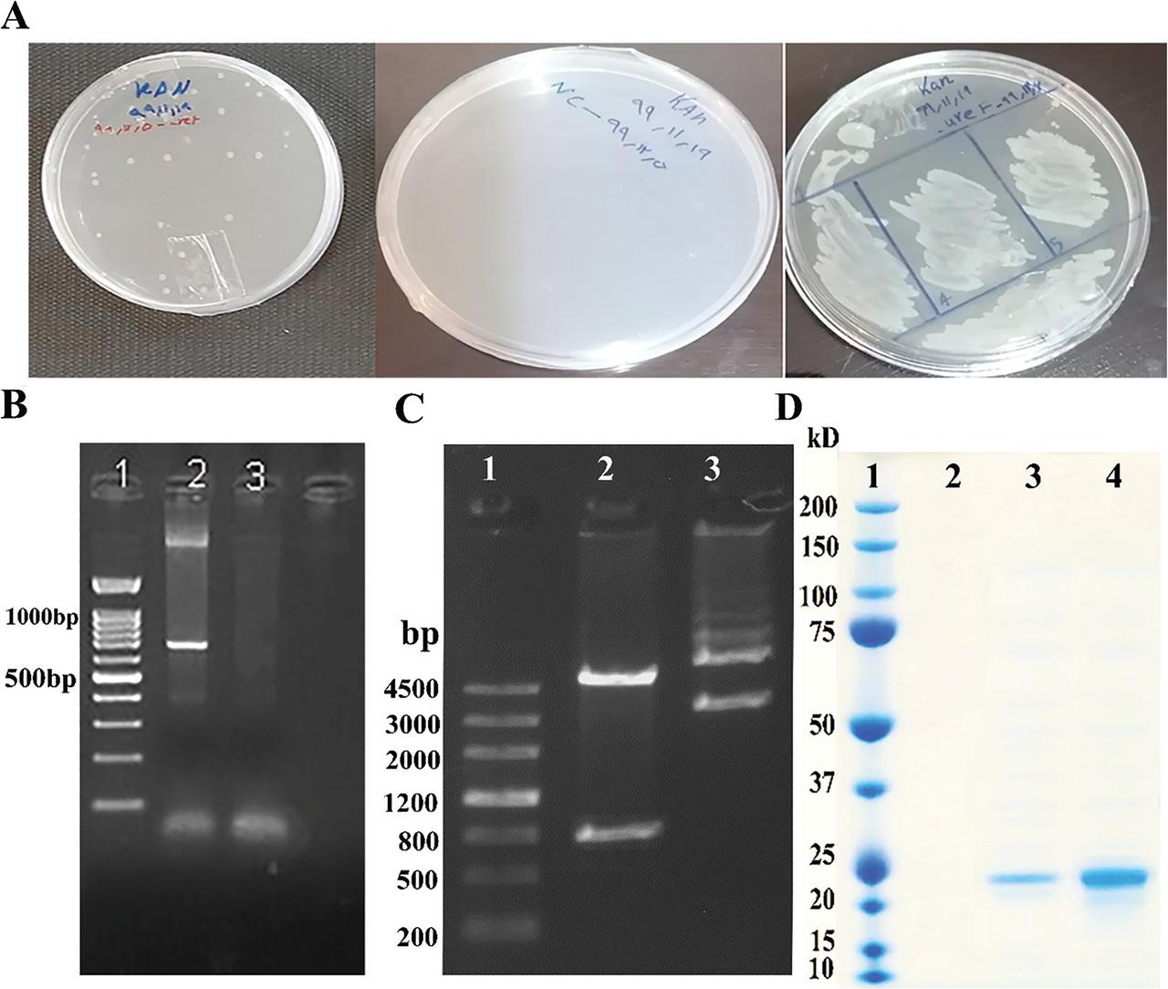 (A) Single colonies of transformed bacteria containing plasmid with uref gene; Non-growth of vector-free cells in agar medium containing the antibiotic kanamycin (negative control); Preparation of matrix from a number of selected colonies. (B) Validation of 805 base pairs of ureF gene in H. pylori genome by PCR test, 1: DNA markerIII, 2: 805 base pairs of ureF gene, 3: Negative control; (C) the successful production of the recombinant plasmid. 1: DNA markerIII, 2: recombinant pIRES2-DsRed-Express-ureF before digestion, 3: recombinant pIRES2-DsRed-Express-ureF after digestion; (D) Expression of recombinant pIRES2-DsRed-Express-ureF in protein level. 1: Protein marker, 2: Negative control; 3 and 4: pIRES2-DsRed-Express-ureF.