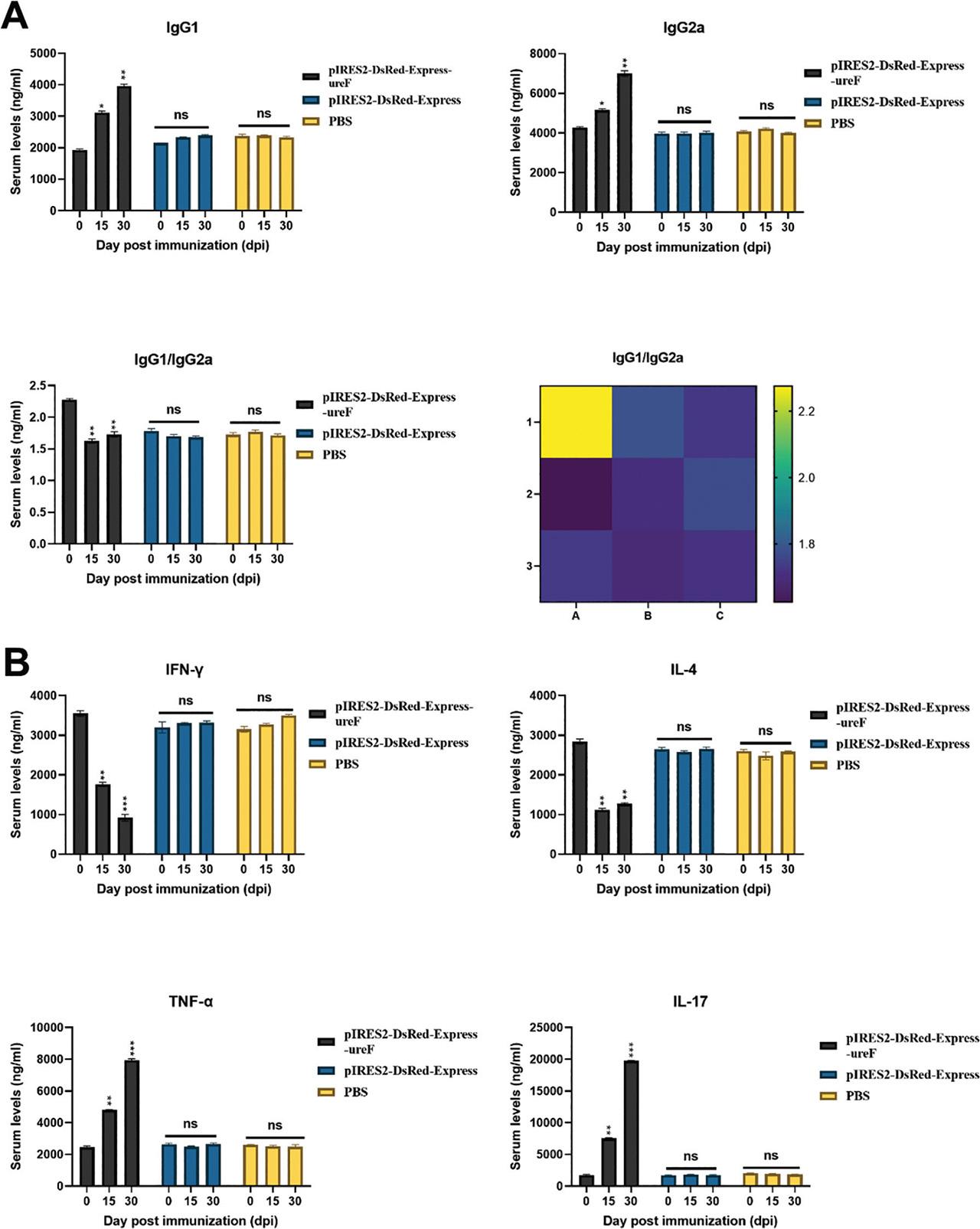 An analysis of the immunological responses and suppressive effects of splenic T-cells induced by H. pylori DNA immunizations. (A) ELISA measured serum IgG1 and IgG2a concentrations in several groups of vaccinated mice. (B) ELISA measurements of TNF-α, IFN-γ, IL-4, and IL-17 relative levels and concentrations in different mouse immunization groups. *P<0.05, **P<0.01, ***P<0.001 and ns: not significant.