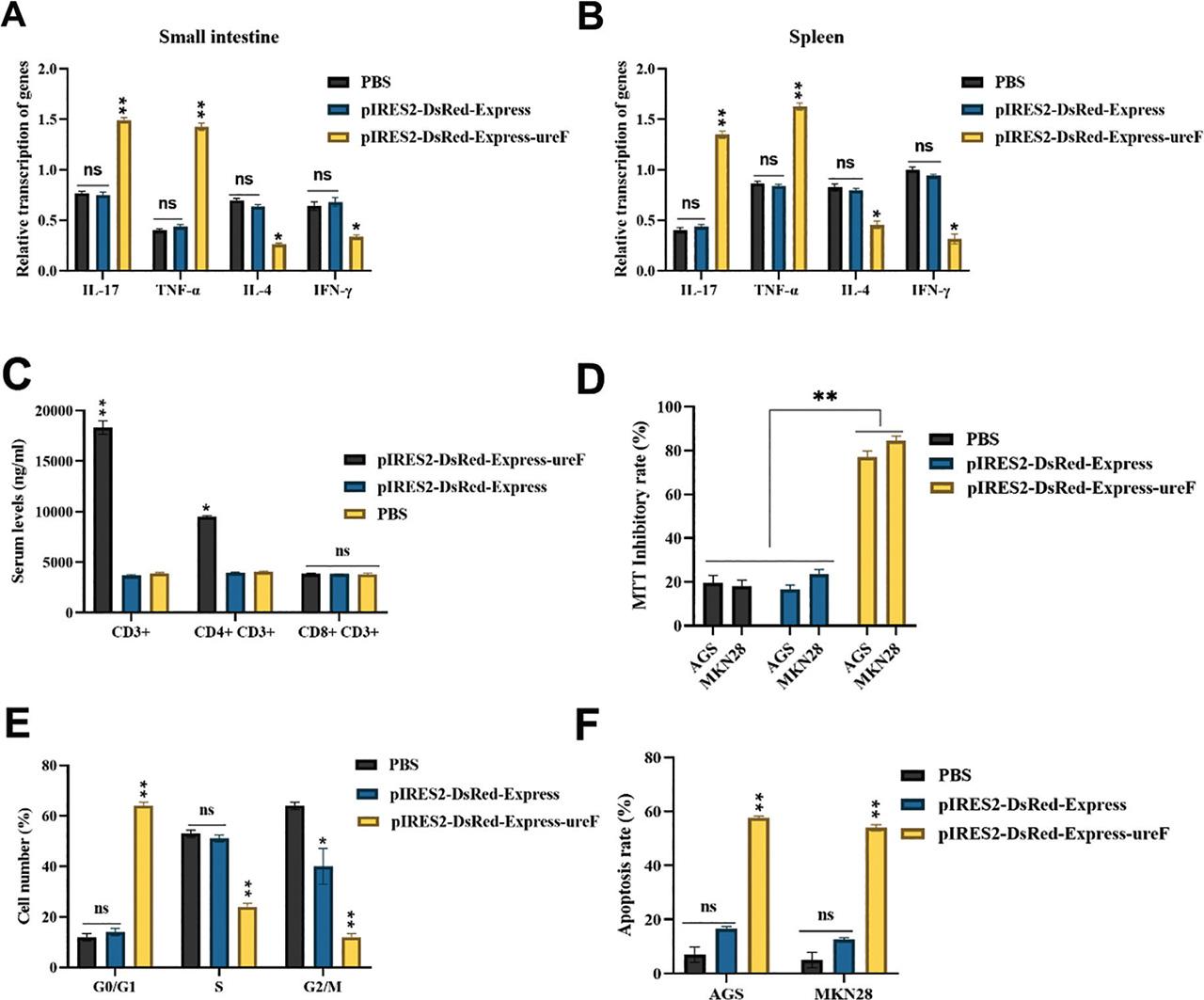 Cytokine levels were found in the small intestine (A) and spleen (B) of the control and immunized groups. (C) Peripheral CD3+, CD4+, and CD8+ T-cell subpopulations in vaccinated mice were analyzed by flow cytometry. The immunization against pIRES2-DsRed-Express-ureF suppresses the invasion and growth of cancerous cells in the culture. (D) The MTT test examined the growth indices of three groups of AGS and MKN28 cells. Compared to the control group, the growth rate in the pIRES2-DsRed-Express-ureF group was considerably reduced. (E) Cell cycle regulation in cells was investigated using flow cytometry. Compared to the control group, the pIRES2-DsRed-Express-ureF vaccination group showed an increase in G0/G1 reduction in the proportion of the S phase to the G2/M phase. (F) The proportion of apoptotic cells was higher in the pIRES2-DsRed-Express-ureF vaccination group. *P<0.05, **P<0.01, and ns: not significant.
