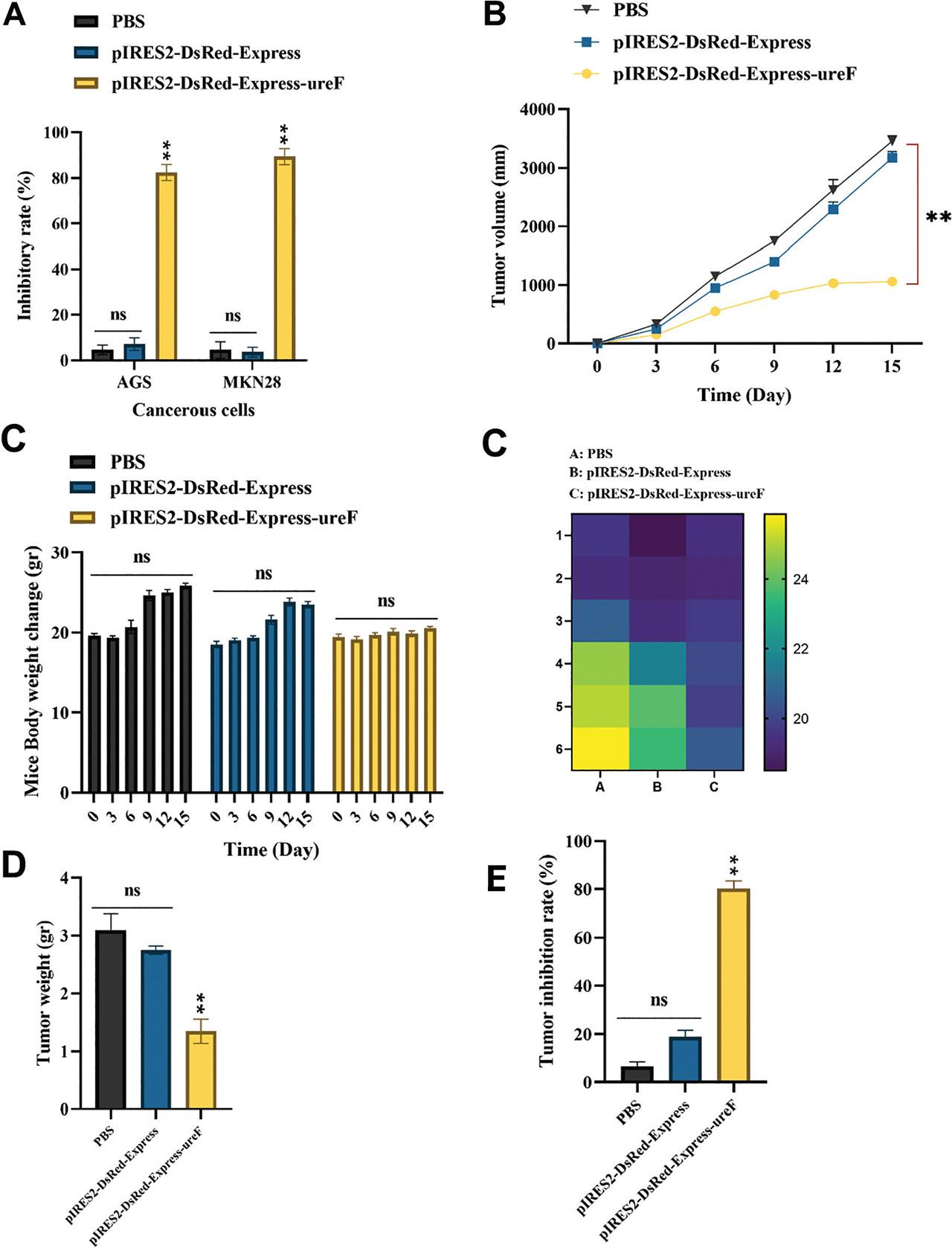 The BALB/c mice are transfused with adoptive CD3+ T cells after being overburdened with GC cells. Compared to the PBS control, tumor growth is inhibited in the immunotherapy treatments with increased tumor necrosis and decreased tumor size and weight (Figure 5b). The mice’ body weight did not differ considerably across the groups (Figure 6a). Early on day 9 following CD3+ T-cell transfer, the tumor size changed, indicating the anti-GC impacts of the H. pylori vaccine-activated T cells. These effects persisted for at least another week (Figure 6b). When compared to the control group, the tumor volume in the pIRES2-DsRed-Express-ureF group has significantly decreased (Figure 6c). According to the changes in tumor size at day 15, the average tumor suppression rates for the pIRES2-DsRed-Express-ureF, pIRES2-DsRed-Express, and PBS groups were 82.3%, 20.1%, 5.2%, and 35.8%, respectively (Figure 6d). The findings indicate that GC development in vivo may be successfully inhibited by adoptively transferred CD3+ T cells stimulated by the H. pylori pIRES2-DsRed-Express-ureF DNA vaccine.