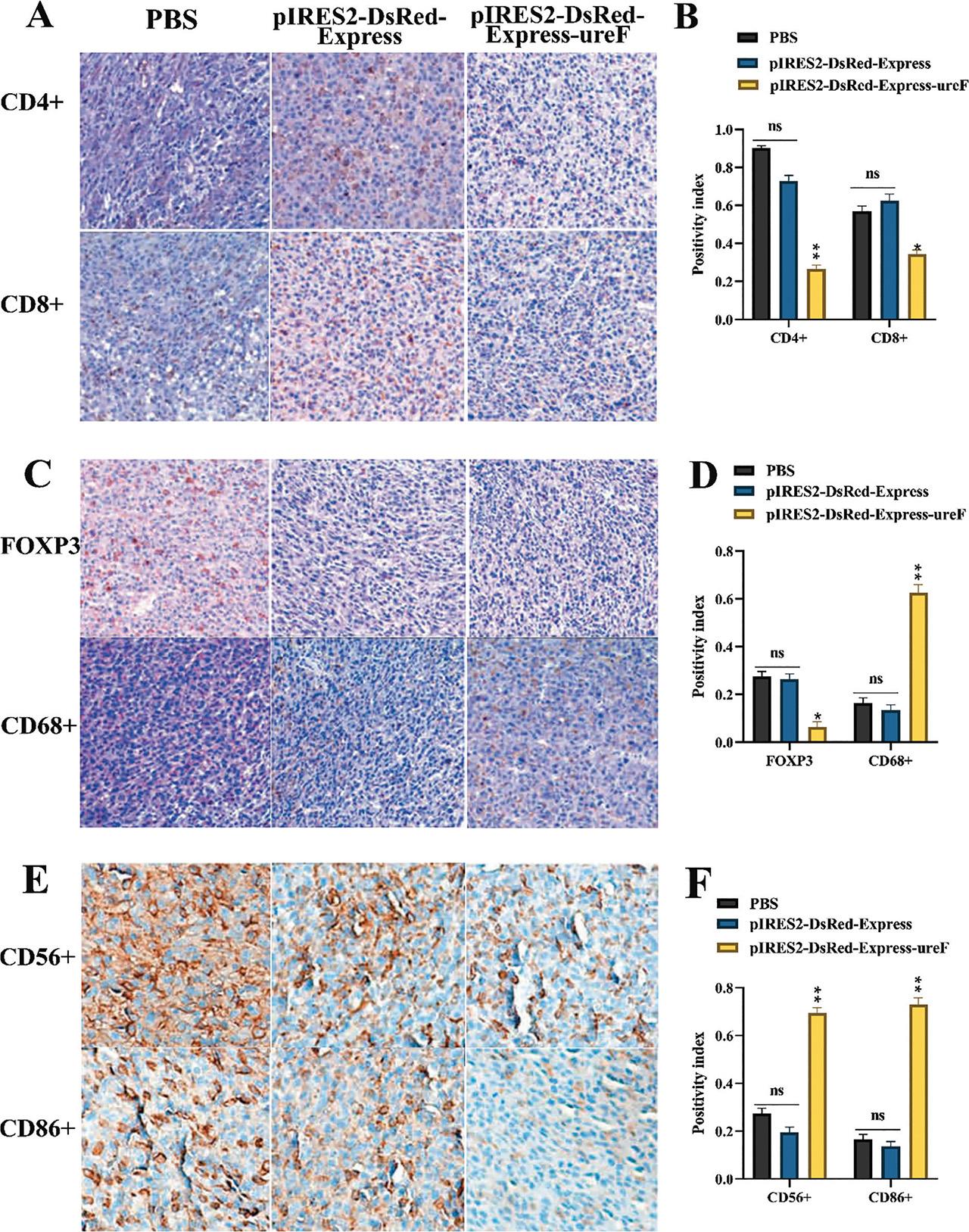 IHC was used to analyze the subtypes of infiltrated CD3+, CD4+, and CD8+ T cells in the intramuscular xenograft of GC. The positive index and the tumor-infiltrating CD4+ T-cell concentrations in all treatment groups reveal lower levels (P < 0.01) (Figure 7a). However, adoptive infusions of the H. pylori DNA immunization CD3+ T cells have little effect on the infiltration of CD8+ T cells in the malignant tissues. In line with this, the ratios of infiltrating CD8+/CD4+ T cells rise dramatically across the board for all immunotherapy groups (Figure 7b). Additionally, compared to the PBS control, labeling of the regulating FOXP3+ T (Treg) lymphocytes in the pIRES2-DsRed-Express-ureF group is lower (Figures 7c and d). Notably, neither the proportions of infiltrating CD86+ macrophages nor the infiltrations of CD68+ macrophages (Figures 7c and d), CD86+ M1 macrophages (Figures 7e and f), CD56+ NK cells (Figures 7e and f), or CD68+ macrophages, indicate significant alterations.