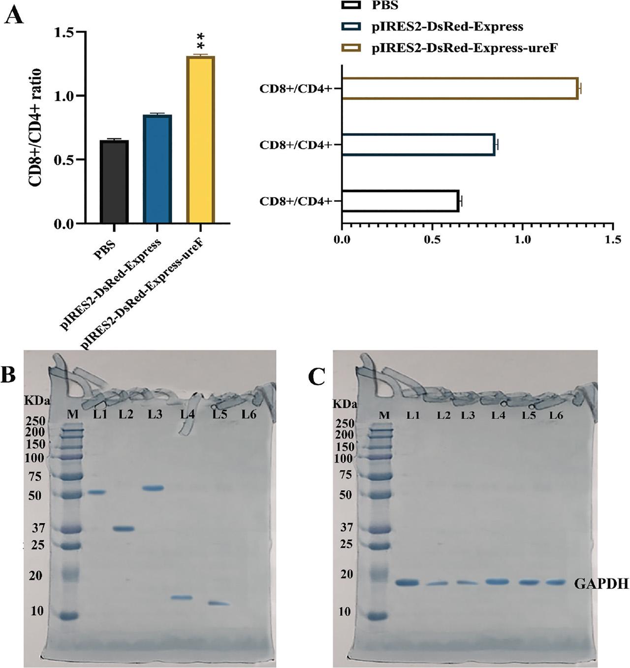 The BGI Genomics Company produced the ureF gene independently (Shenzhen, China). The ureF gene was subsequently inserted into the plasmids pIRES2-DsRed-Express (Invitrogen, USA) to generate pIRES2-DsRed-Express-ureF, which was verified by DNA sequencing and endonuclease digestion assays using BamHI (GGATCC) and EcoRV (GATATC). The constructs have 20 repeats of the CpG ODN C274 motif (5′- TCGTCGAACGTTCGAGATGAT -3′) and a Kozak nucleotide at the N-terminus to boost immunological response. Lipofectamine 2000 was used to transiently transfect the generated plasmids into HEK 293-T cells to confirm the eukaryotic expression vector (Invitrogen). After 48 h of transfection, the cells were collected and lysed. The total cellular proteins were then analyzed using a Western blot kit and a rabbit anti-H. pylori polyclonal antibody (pAb) from LifeSpan BioSciences in Seattle, Washington, USA, following the manufacturer’s instructions.