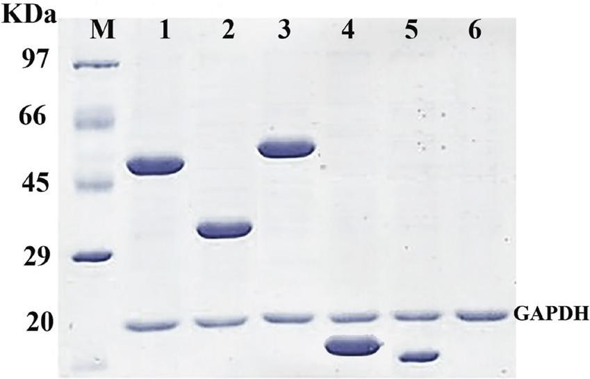 Caspase-9, Caspase-8, Cleaved Caspase-3, and Survivin signals in the xenograft tumor following adoptive T-cell infusions were examined by Western blot analysis. 1: Procaspase-9 (51 kDa); 2: Cleaved Caspase-9 (37 kDa); 3: Caspase-8 (57 kDa); 4: Cleaved Caspase-3 (17 kDa); 5: Survivin (16 kDa); 6: Negative control; M: Protein ladder. GAPDH (20 kDa).