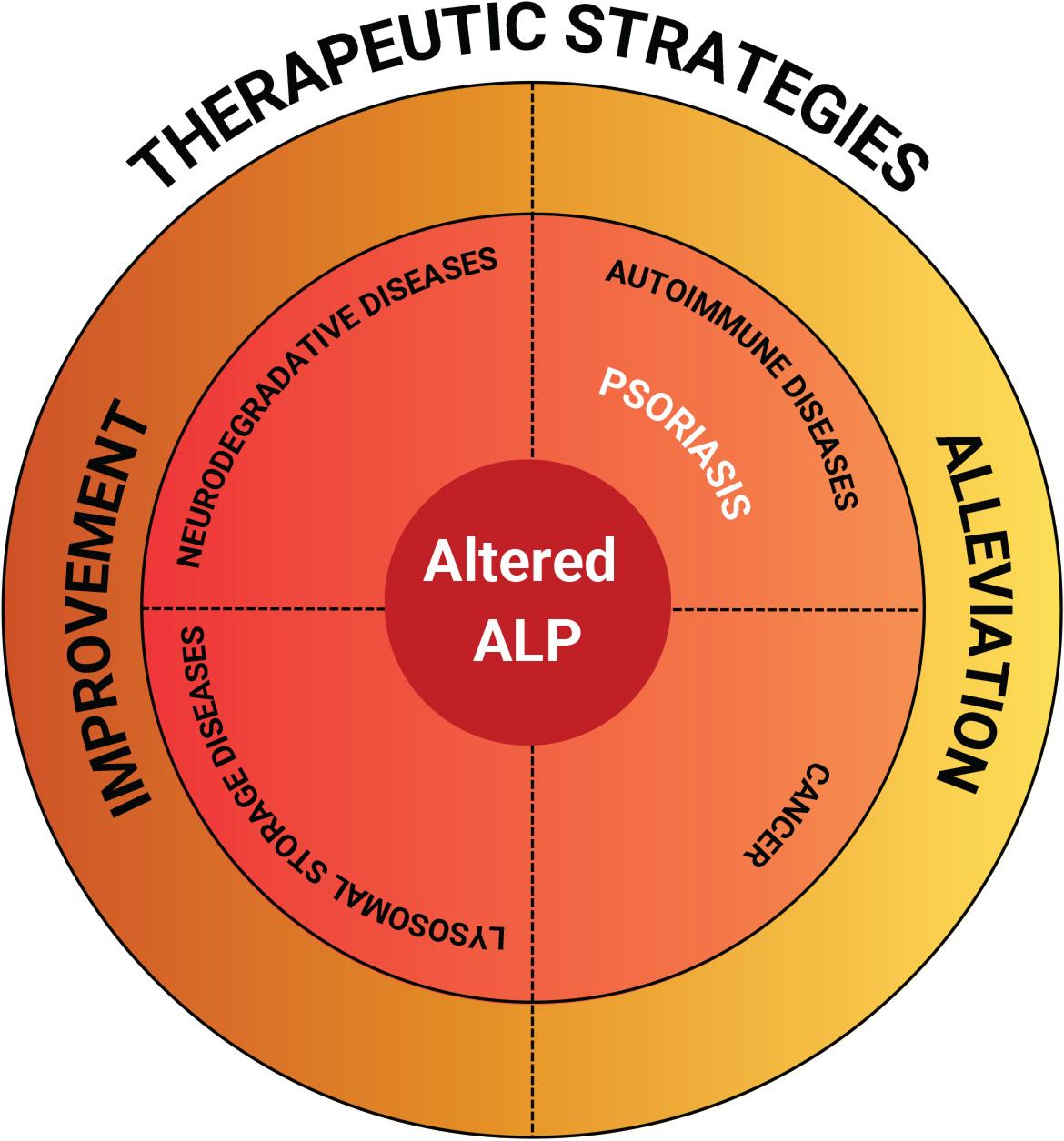 Therapeutic strategies targeting the dysfunctional ALP across different diseases. The figure serves as a comprehensive visual representation, elucidating the dual role of therapeutic approaches in modulating lysosomal action. The diversity of curative methods underscores the versatility and significance of targeting lysosomal functions in disease management. In lysosomal storage and neurodegenerative diseases, the goal is to improve lysosomal function, ensuring efficient cellular cleanup. In contrast, for cancer and certain autoimmune conditions such as Ps, the therapeutic objective is to alleviate or regulate heightened lysosomal activity that may contribute to disease pathology. ALP, autophagy–lysosomal pathway; Ps, psoriasis.