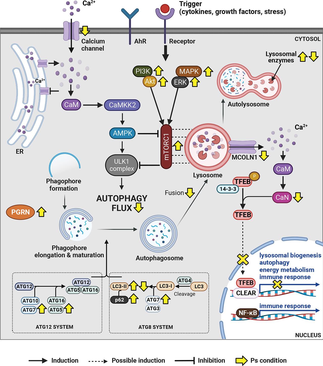 Unique autophagy and lysosomal machinery likely exist in human nonimmune skin cells, skin-resident immune cells, and those immune cells transmigrating between the blood and the skin (Feng et al. 2019; Hailfinger and Schulze-Osthoff 2021b; Klapan et al. 2022). A recent study has shown that impaired autophagy and dysfunctional lysosomal signaling may be involved in the immunopathogenesis of Ps (Bocheńska et al. 2019; Hailfinger and Schulze-Osthoff 2021b). Various stimuli, including starvation, hypoxia, calcium ions (Ca2+), environmental stress, or pathogen-derived molecules, can induce autophagy (Harris et al. 2011; Leidal et al. 2018). Moreover, interleukin (IL)-2, IL-6, interferon (IFN)-γ, and tumor necrosis factor (TNF)-α, involved in the pathogenesis of Ps, are also inducers of autophagy. This multistep process is regulated by autophagy-related (ATG) proteins encoded by autophagy-related (ATG) genes (Botbol et al. 2015; Vega-Rubin-de-Celis et al. 2017). An extensive visual depiction elucidating the intricate molecular signaling pathways implicated in the autophagy machinery and lysosomal biogenesis within Ps-affected human cell is provided in Figure 3. The master regulator of autophagy function and lysosomal metabolism is TFEB, controlled by the intracellular level of Ca2+ and the activity of mTORC1, calmodulin (CaM), and calcineurin (CaN). mTORC1, a master controller of cell growth and metabolism, and mTORC2, which plays an important role in controlling cell proliferation and survival, are two protein complexes containing the mTOR catalytic subunit. While limited knowledge is available on the mTORC2 mechanistic action, extensive studies have shown that mTORC1 is a central signaling node with a dual role in controlling cell growth and metabolism, i.e., promoting anabolic pathways and inhibiting catabolic routes. In physiological conditions, upon intracellular and endoplasmic reticulum (ER) Ca2+ flux, AMPK, transiently activated by CaM, partially inhibits mTORC1. Consequently, the mTORC1 effect on the major lysosomal calcium channel of mucolipin transient receptor potential cation channel 1 (MCOLN1) and TFEB inhibition is somehow diminished (Wu and Eisenman 2021). MCOLN1 releases Ca2+ from the lysosome and activates CaM, which in turn triggers CaN. Activated CaN dephosphorylates TFEB, causing TFEB translocation to the nucleus, where it binds in the promoter region of the genes encoding proteins with lysosomal and autophagy functions (a transcriptional network of genes named coordinated lysosomal expression and regulation [CLEAR] element) (Hailfinger and Schulze-Osthoff 2021b). In turn, as for autophagy induction under environmental stress, low energy, starvation, hypoxia, Ca2+, infection, and also in the case of the Ps inflammatory cascade, AMPK is even more activated and inhibits the mTORC1 via phosphorylation of tumor-suppressor proteins 2 and regulatory associated protein of mTOR. Thus, the level of mTORC1 is reduced, and its effect on MCOLN1 and TFEB markedly weakens. This promotes the release of calcium ions by MCOLN1, activating local CaM, and then CaN, which dephosphorylates TFEB (Wu and Eisenman 2021). Nuclear translocation of dephosphorylated TFEB initiates signal transduction pathways involved in many metabolic processes such as lysosomal biogenesis and exocytosis, autophagy, lipid catabolism, energy metabolism, and immune responses (Settembre et al. 2011, 2013; Medina et al. 2015; Pastore et al. 2016; Slade and Pulinilkunnil 2017; Brady et al. 2018; Scotto Rosato et al. 2019). This situation, associated with autophagy induction, persists for a certain period in the cell; however, in the long term, the deregulation of molecular mediators, i.e., Ca2+ influx and intracellular signaling, reflected among other things, upon Ps inflammatory cascade, affects the majority of the cellular processes. An abnormal Ca2+ metabolism via decreased capacitive Ca2+ influx (e.g., decreased MCOLN1 channel levels in Ps) and an increased cytosolic Ca2+ response to ATP, as well as enhanced secretion of antimicrobial peptides (AMPs), apparently upregulated at least in part as a result of epi-genetic changes (e.g., hypomethylation of the S100A9 gene) are observed in Ps vs. the normal cell status. These alterations amplify the inflammatory immune feedback loop that initiates and sustains chronic inflammation in Ps. The disturbed Ca2+ level in the cell diminishes the AMPK action, activates mTORC1, inhibits ULK1, impairs an autophagic flux, and reduces the fusion of autophagosomes with lysosomes. In addition, during Ps inflammation, the triggered cells are continuously activated in response to a strong admission of cytokines and growth factors on the signaling pathways, promoting the active form of mTORC1 (Werner and Grose 2003; Belleudi et al. 2007; Mitra et al. 2012). Active mTORC1 is found on the surface of the lysosomes and inhibits the flux of Ca2+ from the lysosome into the cytosol through MCOLN1 and directly phosphorylates and inhibits the TFEB nuclear translocation. Inactive, i.e., phosphorylated TFEB interacts with 14-3-3 protein and becomes suspended in the cytoplasm. Thus, it has been concluded that the activity of TFEB is regulated by mTORC1-mediated phosphorylation, defined recently as noncanonical mTORC1 signaling (Napolitano et al. 2022), which controls its nucleocytoplasmic shuttling. Certain stimuli that modulate guanosine triphosphatase Rag activity (Rag GTPase) induce selective mTORC1 regulation, reported as RagA/B-GTP and RagC/D-GDP active configuration of the signaling axis responsible for TFEB phosphorylation. Besides mTORC1, other kinases, including protein kinase B (Akt), extracellular signal-regulated kinase 2 (ERK2), serine/threonine protein kinase 3, protein kinase C β, and the cyclin-dependent kinases (CDKs) 4/6, are also known to be involved in the regulation of TFEB subcellular localization (Palmieri et al. 2017; Li et al. 2018; Puertollano et al. 2018; Yin et al. 2020).