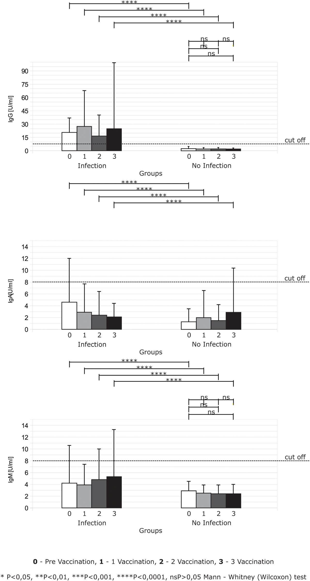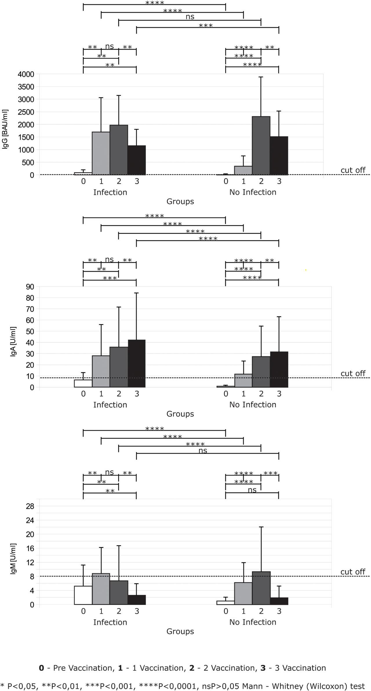 Changes of IgM, IgA and IgG antibodies levels against S1 protein produced post vaccination according to prior infection of SARS- Cov-2_
