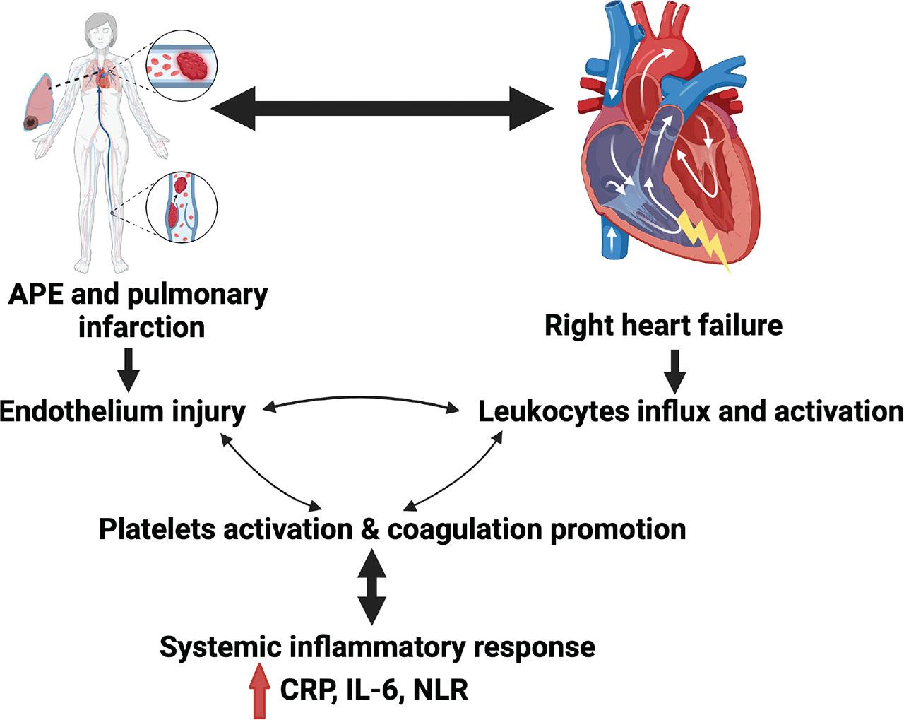 The process of thrombosis is due to the activation of numerous cells, mainly endothelial cells, and PLT, however, it can be postulated that leukocytes activation and inflammatory cytokine release, trigger the coagulation cascade (Darwish et al. 2022). Additionally, established embolisms have been shown to be a source of inflammation. While there are easily accessible biomarkers for APE stratification, such as high-sensitivity Troponin T levels or N-terminal pro-brain natriuretic peptide (NT-proBNP), which indicate RV failure, specific biomarkers dedicated to APE stratification are still lacking (Konstantinides et al. 2019).