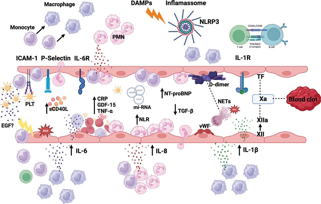 Schematic of immune reactive oxygen species (ROS) response in vessel during VTE. Early in thrombogenesis, adhesion molecules initiate leukocyte accumulation, and adhesion to endothelium for subsequent platelet accumulation. Endothelium injury releases DAMP. Proinflammatory cytokines and ROS, promote inflammasome activation in innate immune cells, primarily macrophages, and neutrophils. IL-1β promotes leukocytes adhesion as well as neutrophils and PLT recruitment. IL-6 is released by infiltrating leukocytes and monocytes and induced endothelial IL-1 production and expression of adhesion molecules and prothrombotic factors, facilitating further platelet recruitment. Systemic inflammatory state can be measured by higher concentration of circulating GDF-15, IL-6, TNF-α. As a response to proinflammatory state and higher IL6 level, CRP is synthesized by the liver. IL-6 also promotes lymphocytes T activation. DAMP and PAMPs are presented to lymphocytes T, resulting in higher sCD40 in bloodstream. Activation of platelet and macrophage NLRP-3 inflammasome induces exaggerated production of IL-1 and NETosis formation. The interaction between NETs DNA and vWF, leads to further thrombus growing. Inflammasome activation results in release of TF, which leads to thrombin generation and fibrin clot formation. Neutrophil express TF resulting in extrinsic pathway activation, however, NETs lead to factor XII activation and intrinsic pathway activation, finally contributing to thrombus development and growth. CRP, C-reactive protein; DAMP, danger-associated molecular pattern; EGF, epidermal growth factor; GDF-15, growth differentiation factor-15; ICAM, intercellular adhesion molecule; IL, interleukin; miRNAs, micro-RNAs; MHC, Major histocompatibility complex; NETs, neutrophil extracellular traps; NLR, neutrophil-to-lymphocyte ratio; NLRP-3, NOD-like receptor protein 3; NT-proBNP, N-terminal pro-brain natriuretic peptide; PAMPs, pathogen-associated molecular patterns; PLT, platelets; PMN, Polymorphonuclear cells; sCD40L, soluble CD40 ligand; TCR, T-cell receptor; TF, tissue factor; TGF-β, transforming growth factor-β; TNF-α, tumor necrosis factor-α; VTE, Venous thromboembolism; vWF, von Willebrand factor. This figure has been created with BioRender.com.