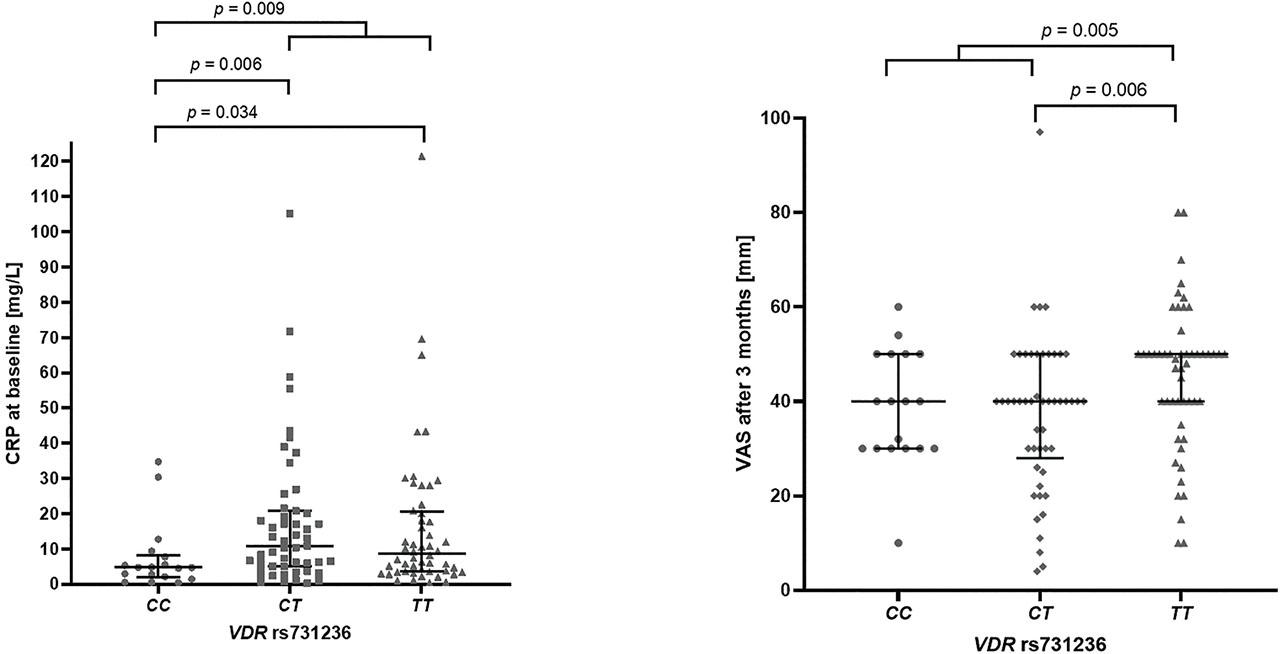 Similar findings were noted concerning rs731236 genetic variants. In this case, CC homozygosity was linked to lower CRP levels at baseline in a dominant model (CC vs. CT + TT, p = 0.009, pc = 0.037) as well as in codominant models (CC vs. CT, p = 0.006, pc = 0.026; CC vs. TT, p = 0.034, pc = ns). Statistically significant associations between higher VAS values after 3 months and the TT genetic variant were also observed in the codominant (CT vs. TT, p = 0.006, pc = 0.024) and recessive (CC + CT vs. TT, p = 0.005, pc = 0.018) models, as shown in Figure 2.
