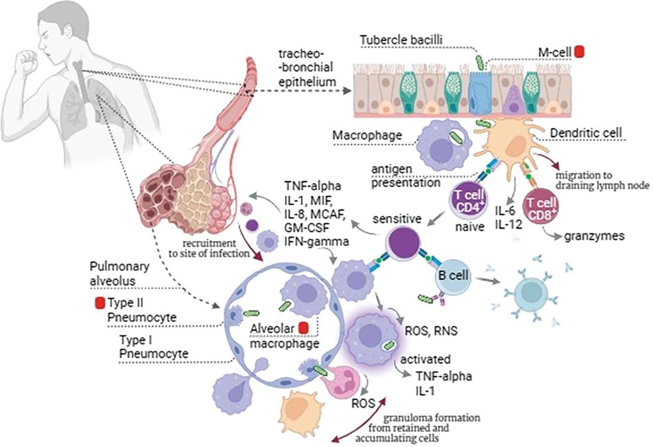 The pathogenesis of NTM-PD is complex, taking months or years to develop, complicating diagnosis and often making it hard to trace the infection source (Wilińska and Szturmowicz 2010; Ratnatunga et al. 2020). Bacteria enter via the respiratory system, colonizing bronchial epithelial cells (Figure 2). The host activates airway clearance mechanisms, but if bacteria persist, they face the innate and acquired immune responses. Fibronectin-binding proteins on bacterial surfaces allow adhesion to the respiratory epithelium via integrin receptors (Honda et al. 2015). Colonizing mycobacteria undergo phenotypic changes, enhancing macrophage conquest. Their ability to inhibit inflammatory cytokine production and form biofilms compromise the immune response, allowing colonization and invasion of bronchial epithelial cells. Mycobacteria present in the macrophages can be killed or maintained within them by inducing NTM genes, inhibiting macrophage functions, lymphocyte proliferation, and causing macrophage destruction and apoptosis (Honda et al. 2015). Activated macrophages produce reactive oxygen and nitrogen species against mycobacteria. Inflammatory response results from cytokine production by activated macrophages and secretion of IL-12 leads to T cell differentiation into Th1 cells. Macrophages also stimulate natural killer (NK) cells with cytotoxic properties. Dendritic cells, M cells, and neutrophils also participate in phagocytosis (Horne and Skerrett 2019). During a specific immune response, T lymphocytes recognize bacterial antigens and transform into effector CD4+ and CD8+ T cells (Nair et al. 2016; Ndlovu and Marakalala 2016; Torrelles and Schlesinger 2017; Li et al. 2021). Antigens presented by antigen-presenting cells through MHC class II molecules are recognized by CD4+ Th1 lymphocytes, producing IFN-γ to enhance antigen presentation and macrophage killing. CD8+ Tc (cytotoxic) lymphocytes recognize antigens through MHC class I molecules, leading to apoptosis of infected host cells. Tc lymphocytes release cytokines like IFN-γ, mediating the immune response. γ/δ T lymphocytes also recognize antigens without MHC C involvement (Shu et al. 2020). When a pathogen evades the host's immune response, it can persist long-term. For M. tuberculosis, mechanisms enabling persistence include granuloma formation, which contain the bacteria and prevent clearance, and enter a dormant state to evade immune surveillance. M. tuberculosis also manipulates the host's immune response by modulating cytokine and chemokine production, influencing granuloma macrophages to undergo transformation to other morphological forms conducive to bacterial survival (Etna et al. 2014; Guler et al. 2021). Granulomas consist of a collection of organized immune cells, and using modern genetic techniques (e.g., parallel ssRNAseq), a high degree of heterogeneity between different granulomas has been shown (Cooper et al. 2024). Host–pathogen interactions modulate the processes leading to the formation of a wide spectrum of granuloma structures even within a single human host. From a histological point of view, in TB frequently the most central part of the granuloma is an acellular caseous necrotic region containing mycobacteria, while it is also possible to form other types of granulomas, which may not have a necrotic area and are composed primarily of macrophages and a few lymphocytes (Guirado and Schlesinger 2013). Macrophages play a key role in the formation of granulomas, and they represent a significant amount of the granuloma cell population, forming the inner layers of the granuloma and acting as a central skeleton that facilitates the organization of other cell types around it. Macrophages undergo “epithelial differentiation,” tightly assembling together to form the granuloma. Epithelial macrophages are a key component of tuberculoid granulomas, accompanied by “conventional” macrophages, foam macrophages, and multinucleated giant cells (Cronan 2022). Other cell types are also identified in the granuloma structure: neutrophils, dendritic cells, eosinophils, mast cells, T and B lymphocytes, NK cells and innate lymphoid cells, and even fibroblasts, and endothelial and epithelial cells, most of which are found in the periphery of the granuloma (Cronan 2022; Weeratunga et al. 2024). NTM mycobacteria are less virulent than M. tuberculosis but can pose serious threats to immunocompromised individuals, such as those with HIV/AIDS or undergoing immunosuppressive therapy (Varma-Basil and Bose 2019). Studies on human leukemia monocytic cell line Tohoku Hospital Pediatrics-1 (THP-1) infected with various NTM strains show that NTMs adopt different strategies to manipulate host defenses for long-term persistence (Sousa et al. 2019). Key factors include phagosome acidification, nitric oxide (NO) production, and cell death. Some strains are cleared within 24 h (M. smegmatis and M. fortuitum), while others replicate (M. avium and M. fortuitum). A study using human cells (THP-1, monocyte-derived macrophages, and alveolar macrophages) infected with various NTM found that macrophage infectivity and virulence vary among NTM species and isolates. Some NTMs evade antibacterial peptides like LL-37 through modified phospholipids, representing a novel virulence mechanism (Honda et al. 2020).