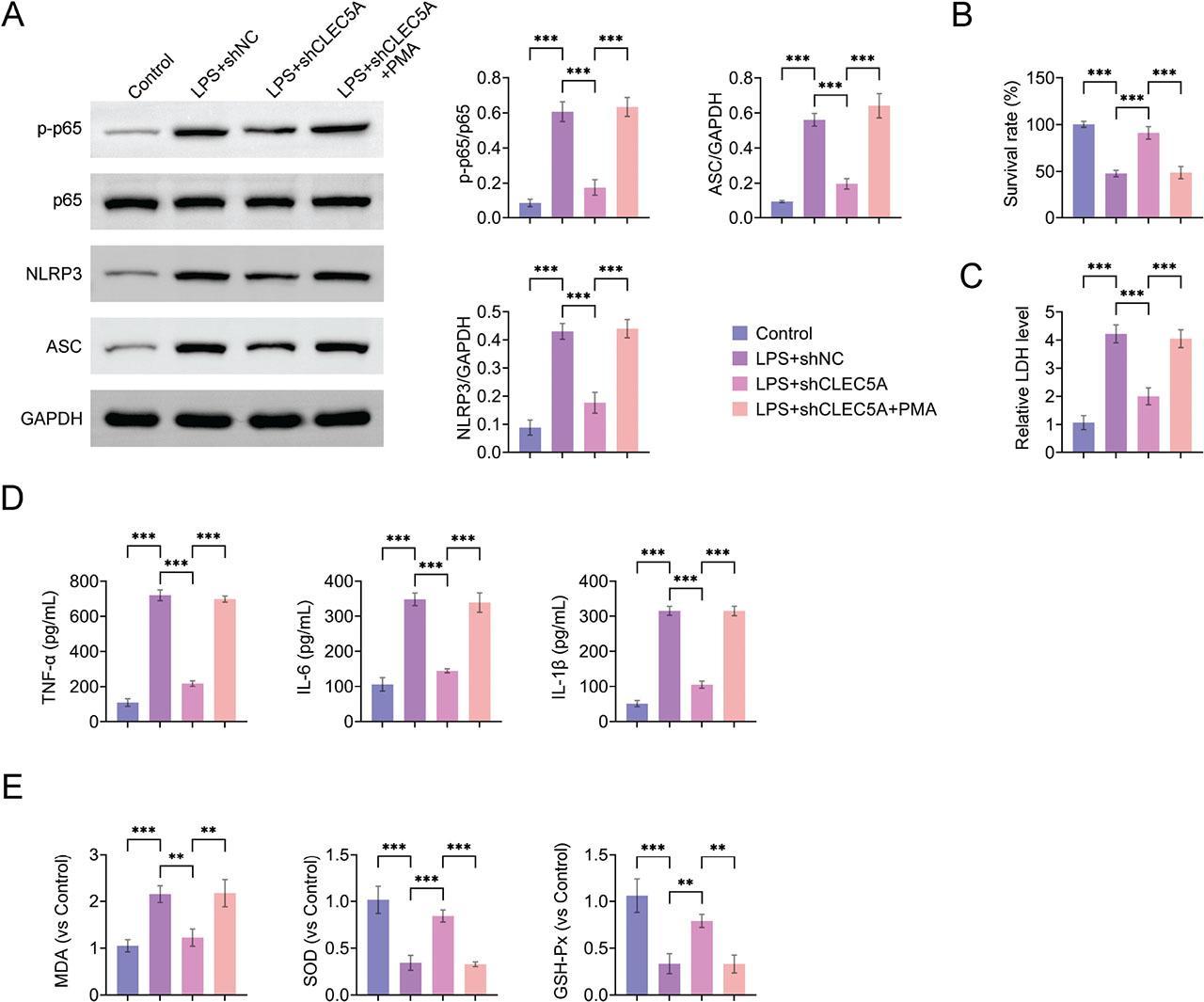 Activation of NF-κB reverses the effects of CLEC5A knockdown on LPS-treated HK-2 cells. (A) Western blotting to detect p65, p-p65, NLRP3, and ASC protein expression. (B) CCK-8 assay for cell viability. (C) Measure LDH production using a commercially available LDH release assay kit. (D) ELISA detects IL-1β, IL-6, and TNF-α levels. (E) MDA, SOD, and GSH-Px levels were measured using commercially available kits in HK-2 cells. Values are presented as mean ± SD. **p < 0.01, ***p < 0.001. n = 3. ASC, CCK-8, cell counting kit-8; CLEC5A, C-type lectin domain family 5 member A; ELISA, enzyme-linked immunosorbent assay; GSH-Px, glutathione peroxidase; IL, interleukin; LDH, lactate dehydrogenase; LPS, lipopolysaccharide; MDA, malondialdehyde; NF-κB, NLRP3, NLR Family, Pyrin Domain Containing Protein 3; SD, shNC, SOD, superoxide dismutase; TNF-α, tumor necrosis factor-α.