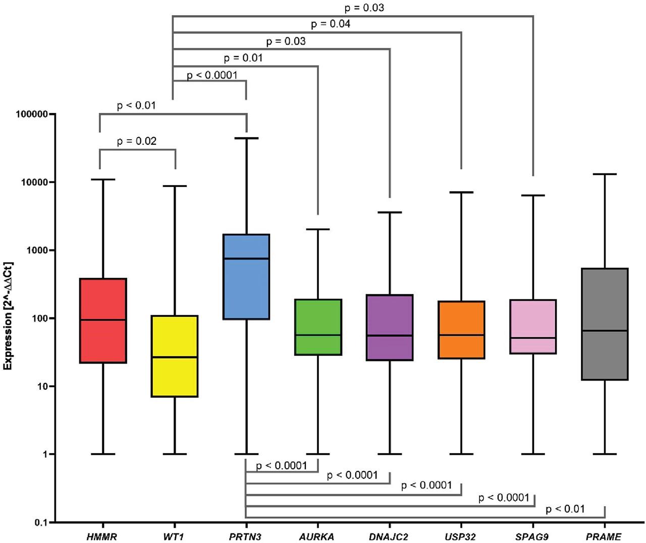 Screening of HMMR, WT1, PRTN3, AURKA, DNAJC2, USP32, SPAG9, and PRAME gene expression in CML patients. The data is presented in a box and a whisker plot, where the whiskers indicate the min-max value, and the box marks the median. We observed statistically significant higher gene expression of HMMR vs. WT1, AURKA vs. WT1, DNAJC2 vs. WT1, USP32 vs. WT1, SPAG9 vs. WT1, PRTN3 vs. HMMR, WT1, AURKA, DNAJC2, USP32, SPAG9, and PRAME. In the remaining pairs, no statistical significance was obtained. CML, chronic myeloid leukemia.