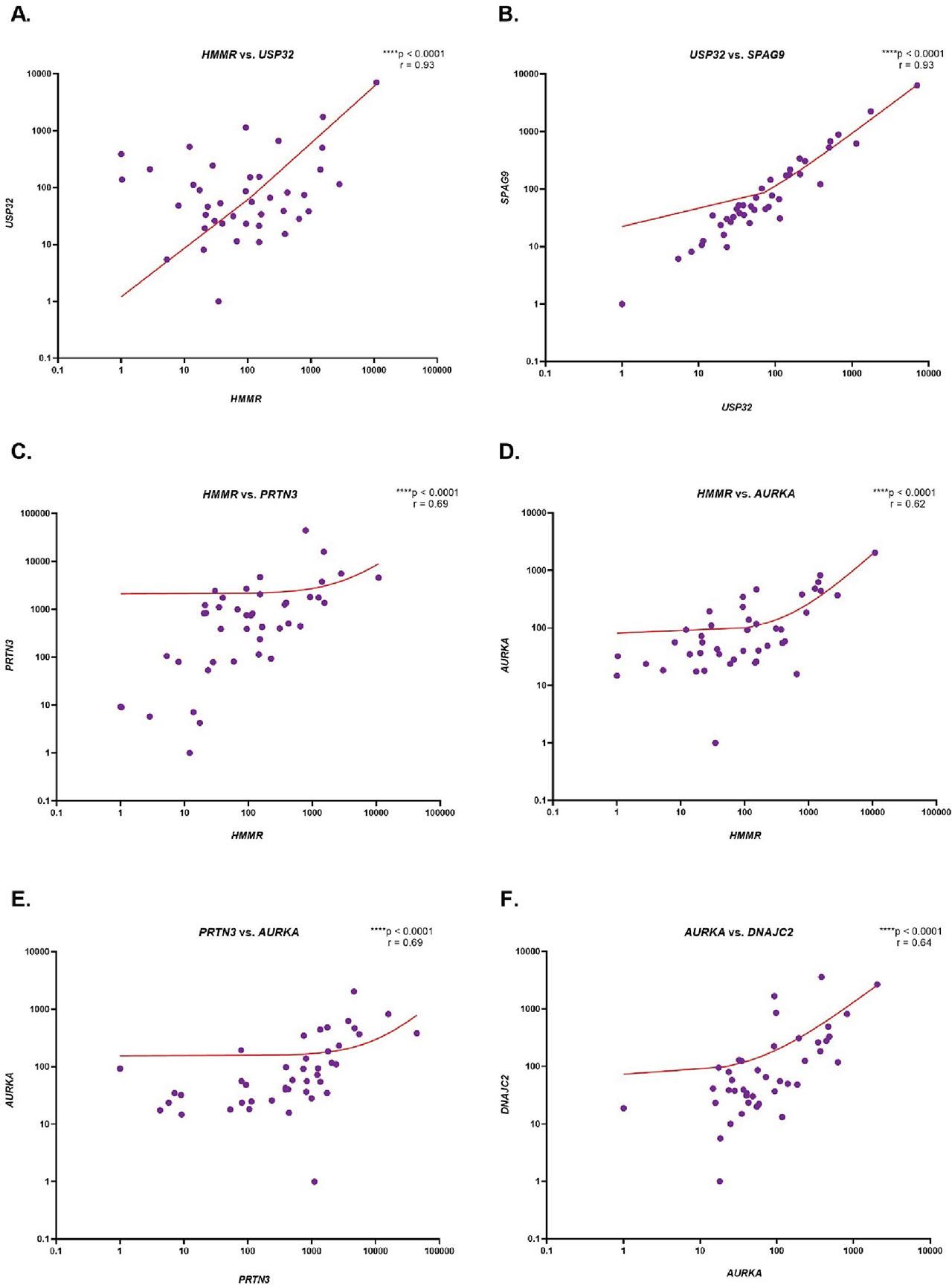 Spearman correlation was used to assess the correlation of expression between the analyzed genes (Figure 2). Very strong positive correlations were shown between HMMR and USP32 (r = 0.93, p < 0.0001, Figure 2a), and USP32 and SPAG9 (r = 0.93; p < 0.0001, Figure 2b). Moreover, there were strong positive correlations between HMMR and PRTN3 (r = 0.69; p < 0.0001, Figure 2c), HMMR and AURKA (r = 0.62; p < 0.0001, Figure 2d), PRTN3 and AURKA (r = 0.69; p < 0.0001, Figure 2e), and AURKA and DNAJC2 (r = 0.64, p < 0.0001, Figure 2f). In addition, moderate positive correlations were observed between HMMR and WT1 (r = 0.44, p < 0.01, Figure 2g), AURKA and USP32 (r = 0.49, p = 0.001, Figure 2h), AURKA and SPAG9 (r = 0.55; p < 0.001, Figure 2i), DNAJC2 and USP32 (r = 0.54; p < 0.001, Figure 2j) and DNAJC2 and SPAG9 (r = 0.54; p < 0.001, Figure 2k). A weak positive correlation was also noted between WT1 and PRTN3 (r = 0.35; p = 0.03, Figure 2l). Among the remaining genes, correlations were not statistically significant.