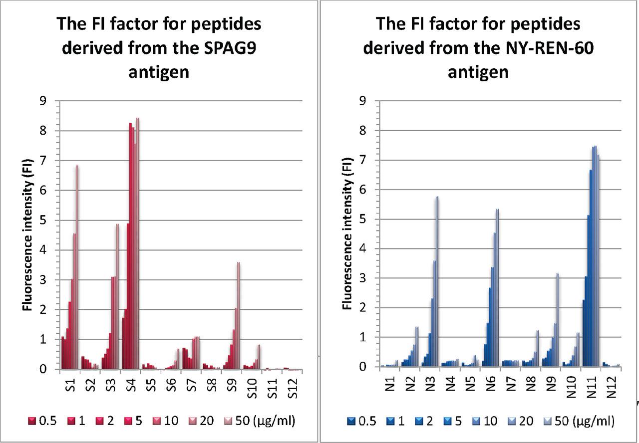 Twelve peptides from SPAG9 and twelve peptides from NY-REN-60, selected based on their highest-ranking positions predicted by the algorithms, were selected (Table 1).