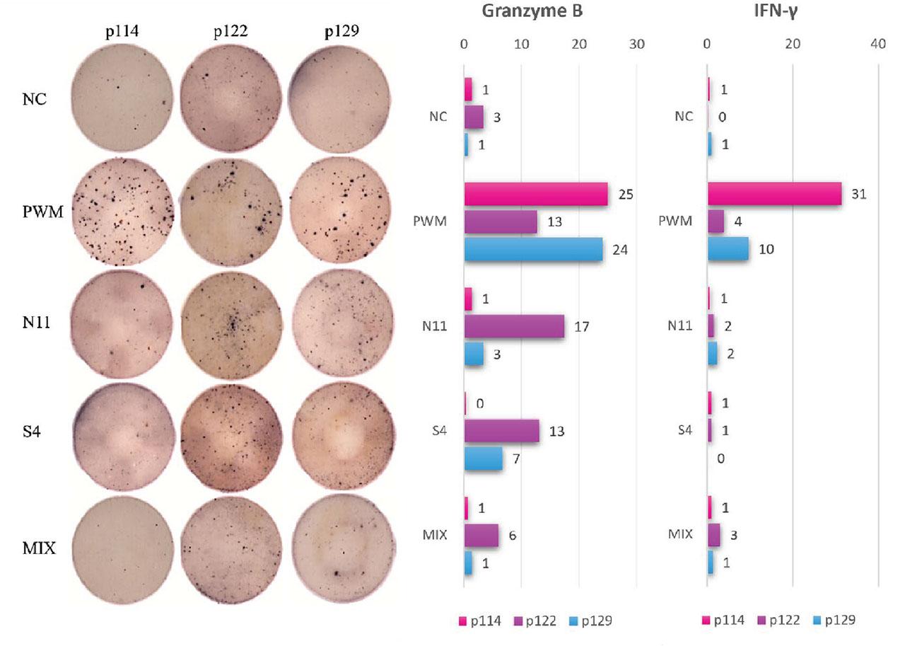 Assessment of specific IFN-γ and granzyme B release was performed using Human IFN-γ/Granzyme B Dual ELISpot according to the manufacturer’s protocol (Diaclone).