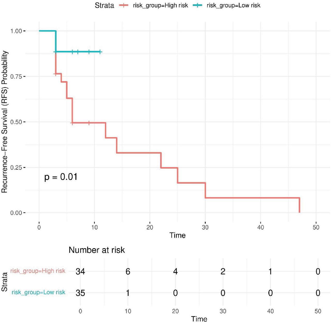 Kaplan–Meier survival curves for high-risk and low-risk patient groups. The Kaplan–Meier plot illustrates RFS in patients stratified into high-risk and low-risk groups based on the median risk score derived from the Cox proportional hazards model and appropriately colored. The survival curves show a clear separation between the two groups, with the high-risk group exhibiting significantly worse RFS, while the low-risk group demonstrates longer recurrence-free intervals. The p-value (p < 0.05) indicates that the difference between the groups is statistically significant, confirming the model’s ability to distinguish between different risk categories. RFS, recurrence-free survival.