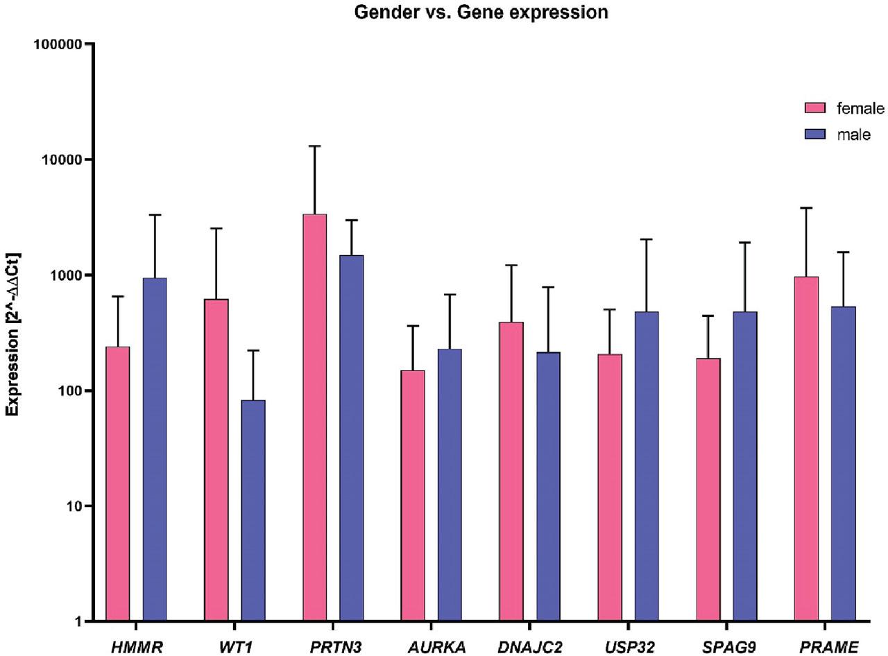 | Analyzed gene | HMMR | WT1 | PRTN3 | AURKA | DNAJC2 | USP32 | SPAG9 | PRAME |