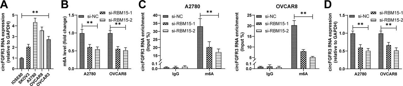 Circular RNAs (CircRNAs) are single-stranded non-coding RNAs that form a circular conformation through atypical splicing or back-splicing events and exhibit dysregulated expression across multiple cancers (Chen and Shan 2021). Accumulating studies have demonstrated that circRNAs can be regulated by m6A modification and serve as key regulatory molecules in the oncogenesis of OC (Zhao et al. 2020; Tian et al. 2023; Li et al. 2024). Notably, circRNA fibroblast growth factor receptor 3 (circFGFR3) is upregulated in OC and drives the progression of cancer cells and associated with a lower survival rate and a higher recurrence rate (Zhou et al. 2020). Bioinformatic analyses predict the existence of m6A modification in circFGFR3, but the role of RBM15-mediated m6A modification on circFGFR3 remains to be elucidated.
