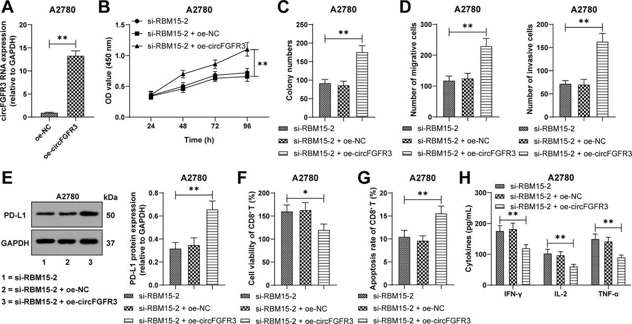 CircFGFR3 overexpression promotes immune escape and alleviates the inhibitory effect of RBM15 downregulation on OC cell progression. oe-circFGFR3 was transfected into A2780 cells, with over-expression negative control (oe-NC) transfection used as a negative control. (A) The transfection efficiency of circFGFR3 in cells was detected by RT-qPCR. (B,C) Cell proliferation was detected by CCK-8 and colony formation assays. (D) Cell migration and invasion were detected by Transwell. (E) The expression of PD-L1 in cells was detected by Western blot. A2780 cells in each group were co-cultured with CD8+ T cells. (F) The viability of CD8+ T cells was determined by the CCK-8 method. (G) Apoptosis of CD8+ T cells was detected by flow cytometry. (H) The secretion of cytokines was detected by the ELISA method. Three independent repeated tests were carried out, and the data were expressed as mean ± standard deviation. The t-test was used for data comparison between two groups in panel (A). One-way ANOVA was used for data comparison among multiple groups in panels (C–G), and two-way ANOVA was used for data comparison among multiple groups in panels (B) and (H). Tukey's multiple comparisons test was used for post hoc test. *p < 0.05, and **p < 0.01. ANOVA, analysis of variance; CCK-8, cell counting kit-8; circFGFR3; circRNA fibroblast growth factor receptor 3; ELISA, enzyme-linked immunosorbent assay; OC, ovarian cancer; PD-L1, programmed death-ligand 1; RBM15, RNA binding motif protein 15; RT-qPCR, real-time quantitative polymerase chain reaction.