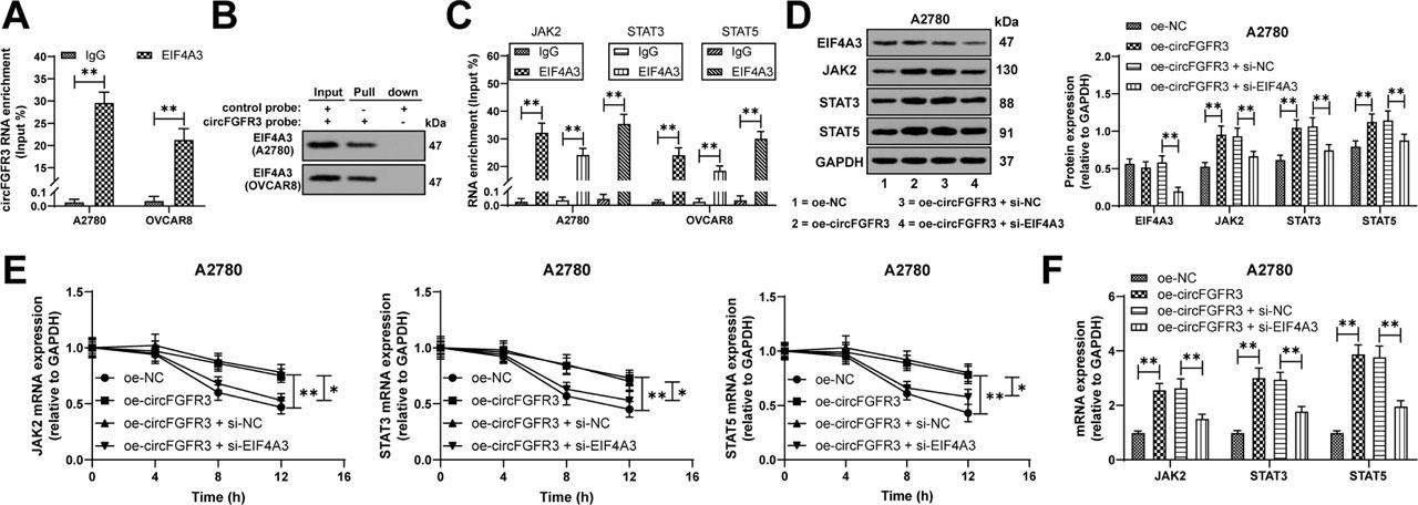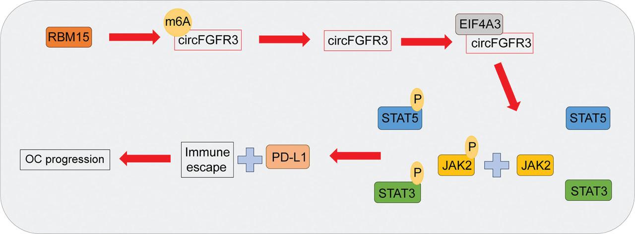 In conclusion, our study is the first to report the role of RBM15 in OC immune escape and proposes a novel mechanism, revealing that RBM15 upregulates circFGFR3 expression through m6A modification and circFGFR3 binds to EIF4A3 to enhance the mRNA stability of JAK2, STAT3, and STAT5, activating the JAK/STAT signaling pathway and promoting PD-L1-mediated immune evasion, thereby accelerating OC progression. These findings may provide novel research directions for OC immunotherapy.