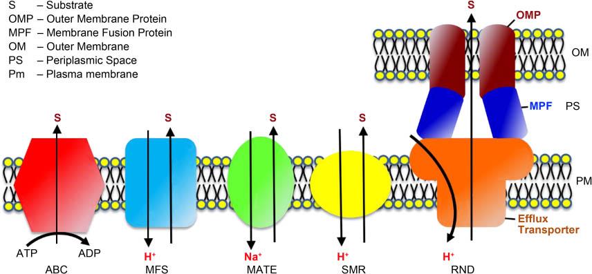 (ABC) ATP-Binding Cassette Superfamily [17]; (MFS) Major Facilitator Superfamily [18]; (MATE) Multidrug And Toxic Compound Extrusion Family [19]; (SMR) Small Multi-Drug Resistance Family [20]; (RND) Resistance-Nodulation-Division Superfamily [21].