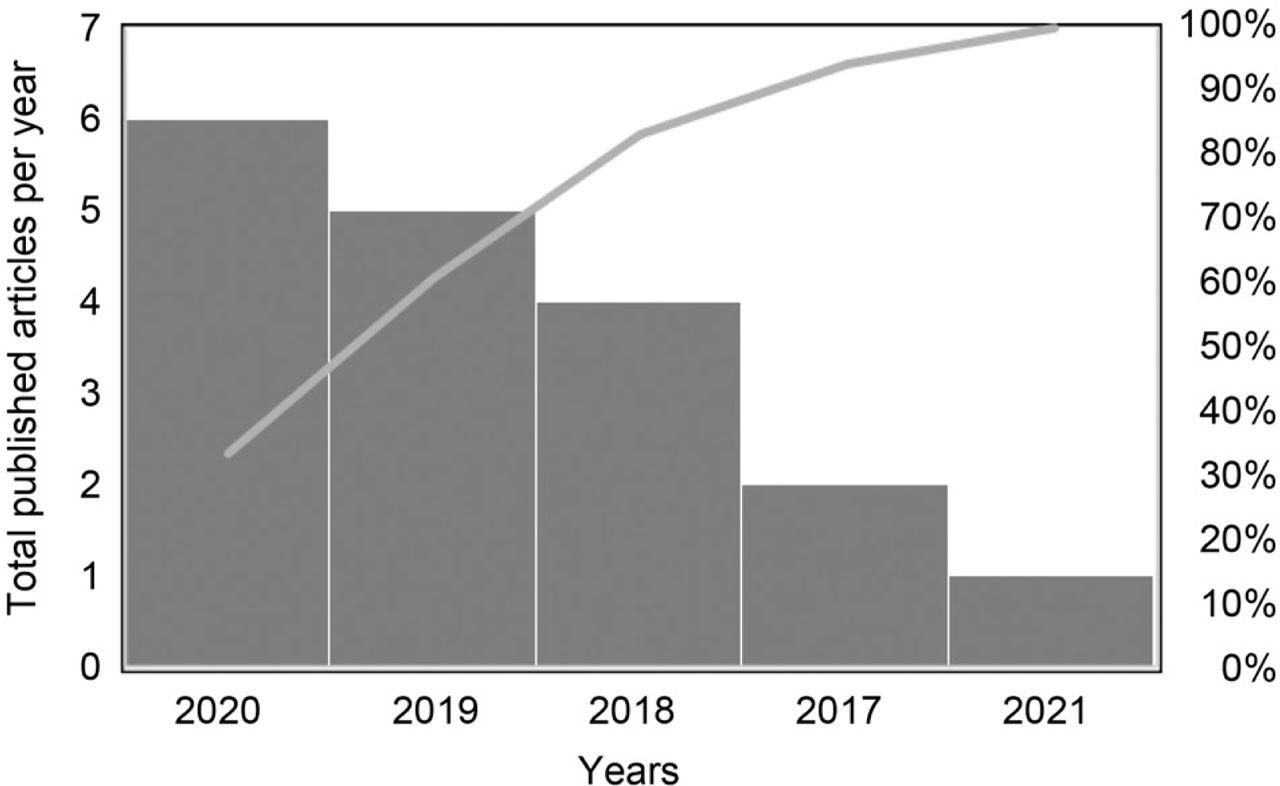 Bioleaching using OA is still considered a new subject. According to Clarivate Analytics, during the last 5 years the total amount of articles published, including early access articles related to this subject, were 18 (Fig. 1), and doing a broader search from 1980 to 2021, a total of 42 publications were found.