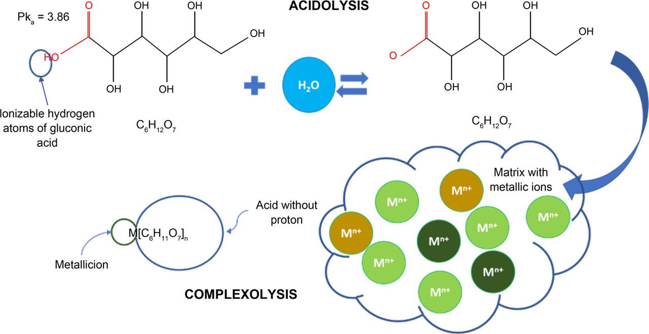 | Gluconic | C6H12O7 → C6H11O−7 + H+ | 3.86 | n[C6H11O−7] + Mn+ → M[C6H11O7]n |