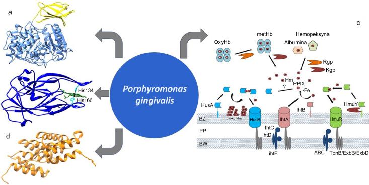(a) Scheme of the catalytic domain of gingipain; (b) structure of HmuY protein, (c) operons in the bacterial membrane and its heme-binding mechanism, and (d) structure of HusA protein (modified from Smiga et al. 2020, “Virulence mechanisms used in the pathogenesis of periodontal diseases caused by Porphyromonas gingivalis”).