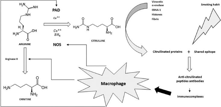 Putative biological pathways that may be responsible for the loss of tolerance for citrullinated proteins (modified from Alivernini et al., 2008, “Citrullination: the loss of tolerance and development of autoimmunity in rheumatoid arthritis”. Reumatismo).