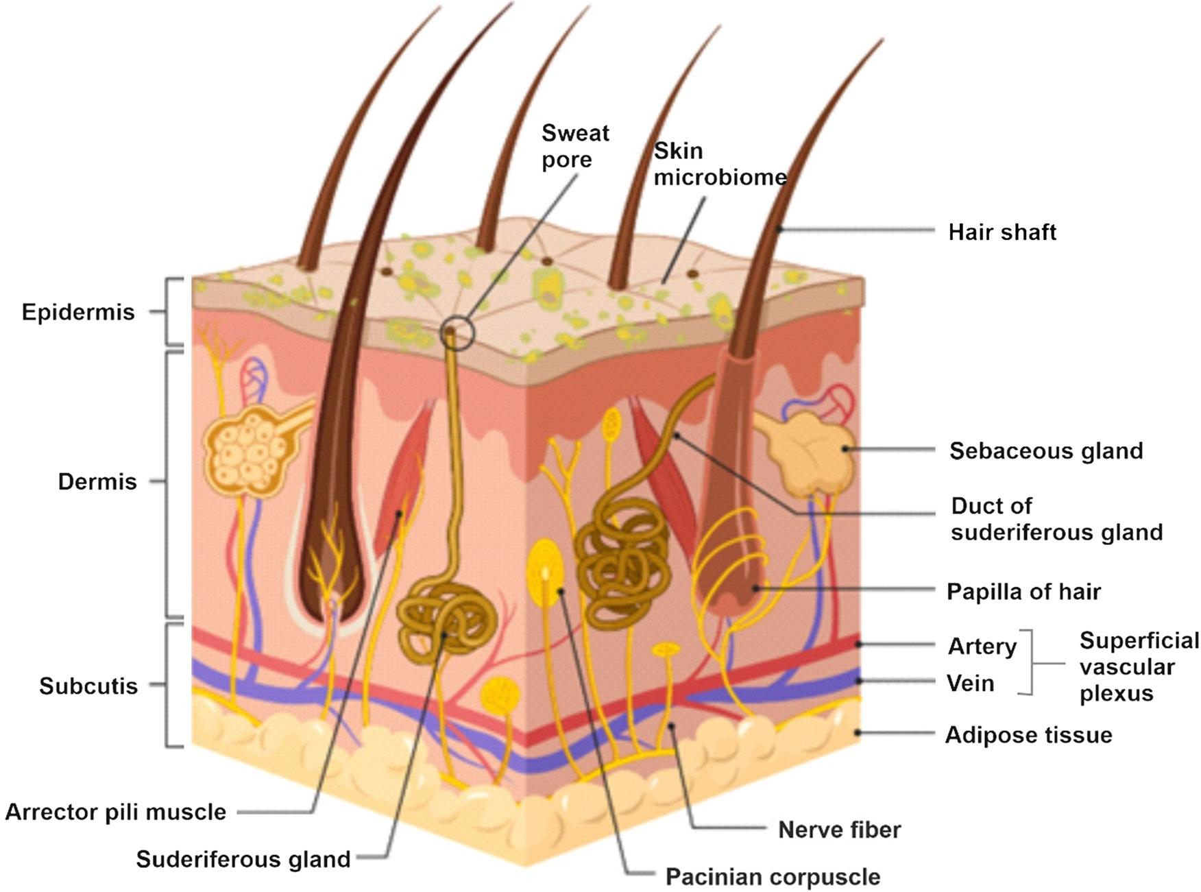 General plan of human skin structure; created with Biorender.com