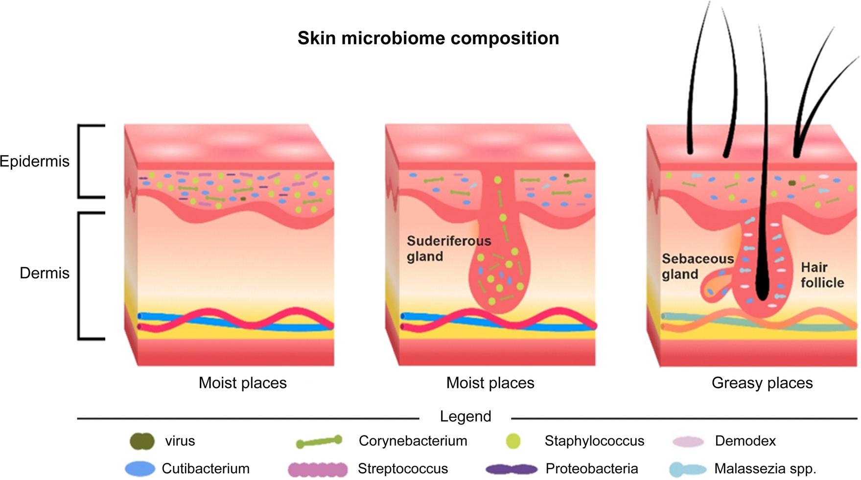 Skin microbiota composition depends on many factors (Sanford and Gallo, 2013; Sfriso et al., 2020; Smythe and Wilkinson, 2023). One of them is the site on the skin. In their study, Grice et al. analyzed 20 different sites on the human skin of 10 healthy patients. They proved that Cutibacterium and Staphylococcus predominated in sebaceous areas, while Corynebacterium species resided in the highest numbers in moist areas (Grice et al., 2008). On the other hand, a strongly mixed bacterial population was observed in dry areas, with a higher frequency of β-proteobacteria and Flavobacteria (Prescott et al., 2017). On the other hand, a study by Costello et al. showed much greater phylogenetic diversity at various sites on the skin compared to the microbiota of the gut, external auditory canal, or oral cavity. Ethnicity has also been shown to contribute to the diversity of the skin microbiota and is partly related to lifestyle (Costello et al., 2009). For example, differences in microbiota composition have been shown between individuals of East Asian and European or African descent (Harker et al., 2014). Significant differences are observed, for example, in the axillary region, where the abundance of Staphylococcus varies significantly concerning Corynebacterium (Cogen et al., 2008; Dréno et al., 2018; Flowers and Grice, 2020). The study by Perez et al. proved that the microbiota of the arm of African-American men is relatively homogeneous but significantly different from other ethnic groups. Similar conclusions were reached after studying the axillary microbiota of East Asian men; relative to the other ethnic groups, the microbial composition was quite different. What is more, East Asian individuals have a higher total amount of bacteria and proteobacteria relative to other groups (Perez et al., 2016). The distribution of Corynebacterium species was also analyzed, and it was found that Corynebacterium variabile is found only in Hispanics. In contrast, Corynebacterium kroppenstedtii is found only in the East Asian group (Boxberger et al., 2021). However, in this era of mass population migration, a complete definition of skin microbiota according to ethnicity is impossible. Physiological differences between male and female skin, such as different hormone levels, sweating rates, or skin surface pH, are also observed (Fierer et al., 2008). The most remarkable differences are observed in the hand microbiota of men and women. It has also been shown that a higher amount of Cutibacterium and Corynebacterium is found in men than in women (Lee et al., 2019). In contrast, bacteria from the Enterobacteriaceae, Moraxellaceae, Lactobacillaceae, and Pseudomonadaceae families are more abundant in women. Staphylococcus spp. occurs in significantly higher numbers in women than men, while Corynebacterium spp. is far more likely to colonize men’s skin (Grice et al., 2008; Perez et al., 2016; Boxberger et al., 2021; Robert et al., 2022). Observing the distribution of Malassezia species in studies conducted by Prohic et al., no significant sex effect was found (Prohic et al., 2016). Leung et al. showed that males had higher amounts of Cutibacterium, Staphylococcus, and Enhydrobacter, while Streptococcus was observed in higher amounts in the female population. The Epicoccum and Cryptococcus genera were found in higher amounts in sebaceous areas in men, while Malassezia was mainly observed in women (Leung et al., 2015). Li et al. observed that men have higher amounts of Corynebacteria, although the difference is insignificant (M. Li et al., 2019). However, only males host Corynebacterium amycolatum and Corynebacterium kroppenstedtii, while females only host Corynebacterium urealyticum and Corynebacterium variabile (C. Xi Li et al., 2019). It is also essential to look at the impact of the aging process on the composition of the skin microbiota. Indeed, aging is associated with many changes in skin characteristics and features, such as the appearance of spots and wrinkles and altered sebaceous gland activity, thereby affecting the composition of the skin microbiota. A study by Somboon et al. found a significantly higher prevalence of Plantomycetes and Nitrospirae bacteria in adolescents than in other age groups (Wilantho et al., 2017). On the other hand, senile individuals show a significantly lower amount of Cutibacterium compared to the other age groups and an increased amount of Corynebacterium and Acinetobacter (Dessinioti and Katsambas, 2017; Dreno et al., 2017). In older adults, there is also an increase in Proteobacteria and a decrease in Actinobacteria (Wilantho et al., 2017). Contemporary studies also show decreased sebum production with age, reducing available nutrients for commensal bacteria and an increased possibility of spreading opportunistic bacteria (Boxberger et al., 2021). Significant variation with age is also observed within Malassezia. For example, Malassezia furfur is characteristic of children’s trunk skin, while Malassezia restricta predominates on the scalp of individuals between the ages of 21 and 35. In older people, on the other hand, Malassezia sympodialis predominates (Prohic et al., 2016). Demodex spp. mites, studies show, are characteristic of older adults, and in the over-70 age group, they are found in up to 95% of (Adamczyk et al., 2018; Boxberger et al., 2021).